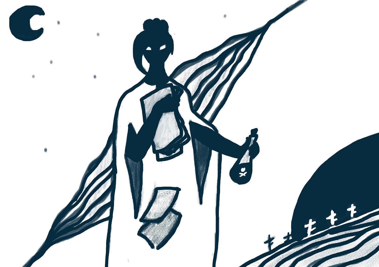 Например, вот тут я подумала: ой, надо же, какая милая девушка с пучком на голове, бумагами в руках, бутылкой яда и могилками на фоне, какое удивительное совпадение, наверняка это не мне... Да, это действительно оказалась Лимейк, которую мне нарисовала Екатерина Близнина)