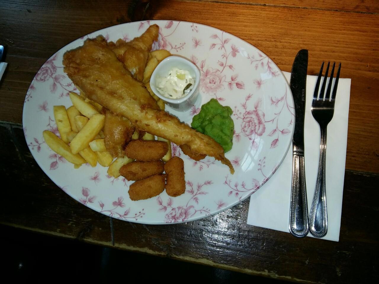 Fish and chips - рыба с жареным картофеле . Едят все , везде , всегда .