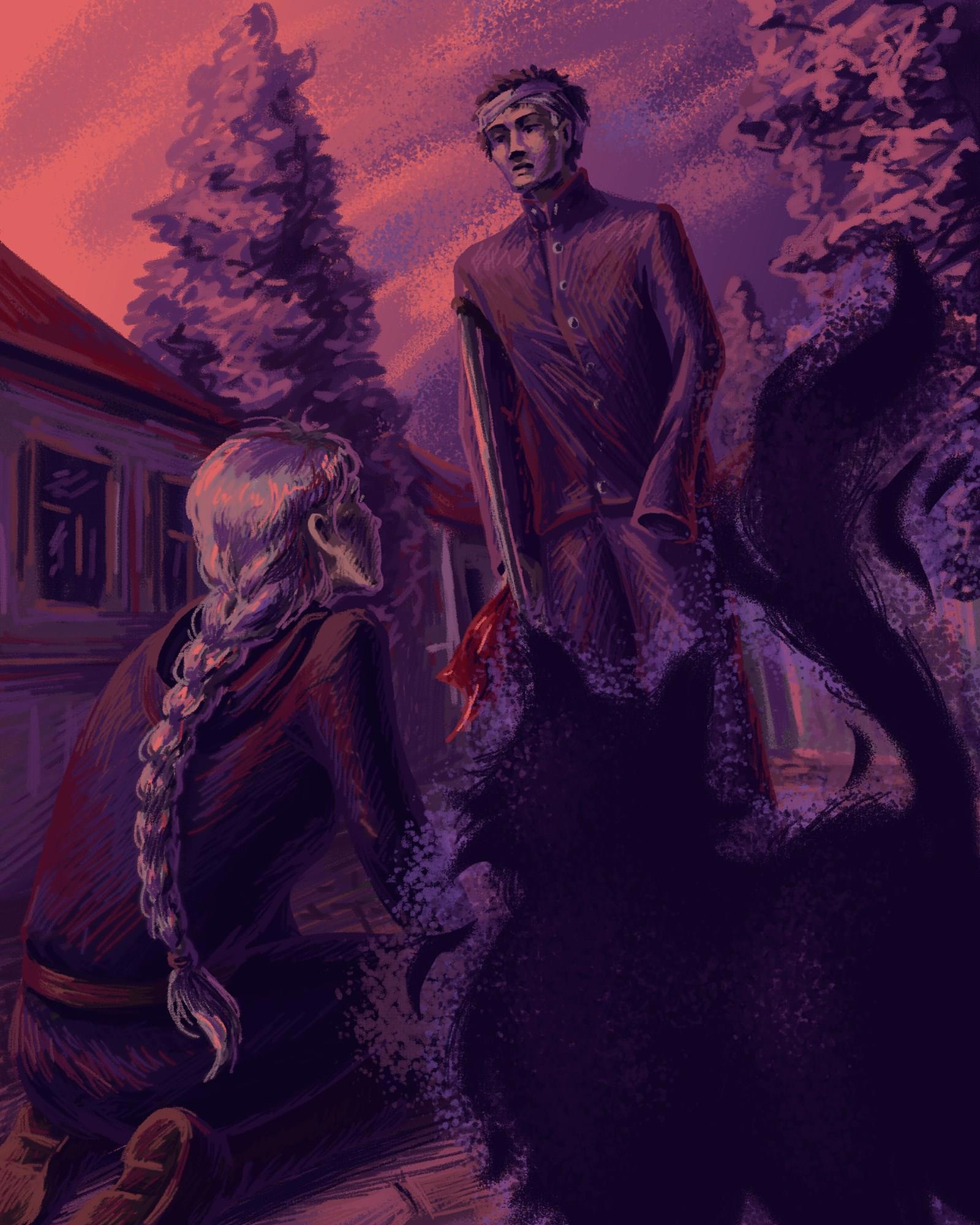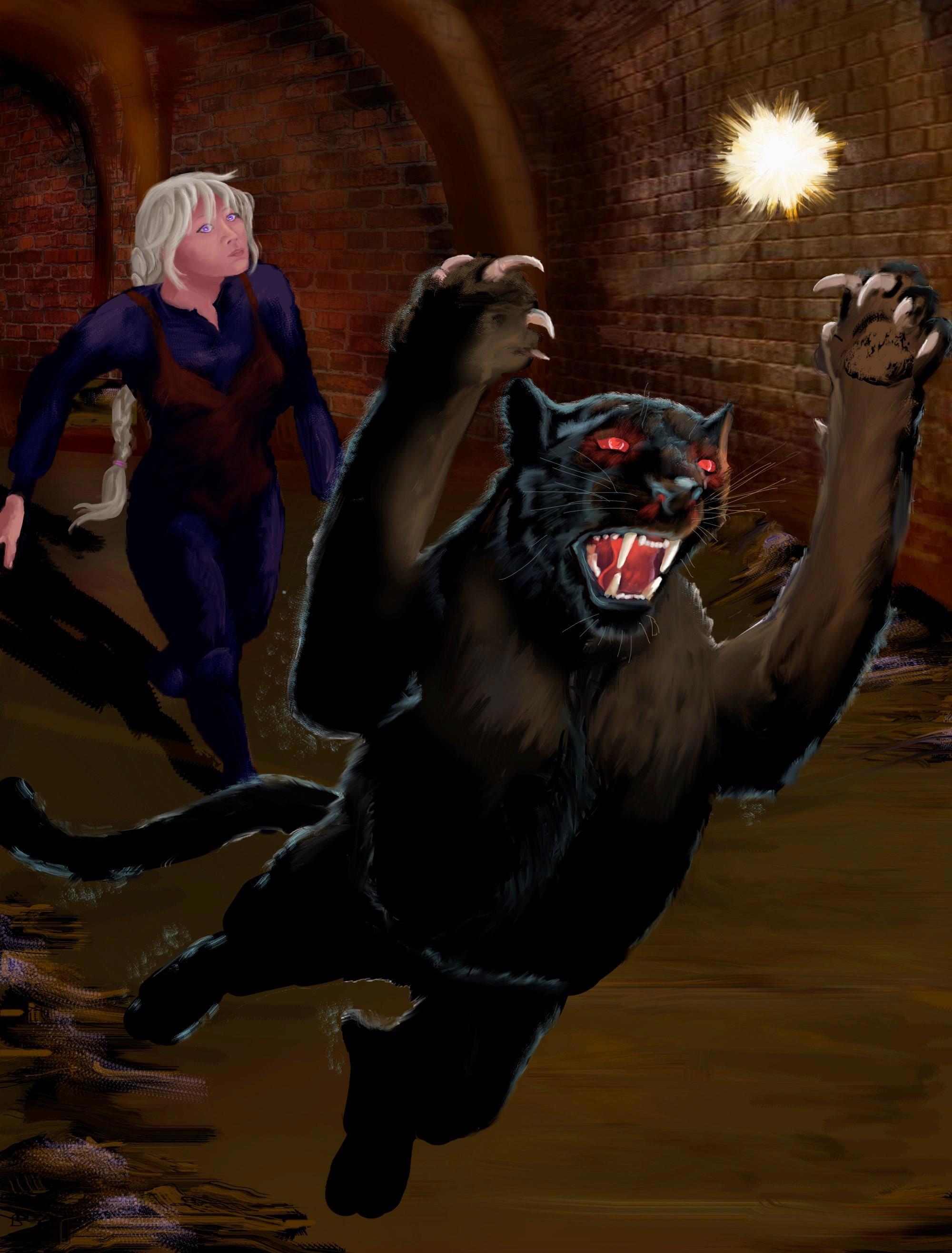 И впервые отъевшаяся к финальным главам теневая кошка была нарисована так, как я задумывала: в виде красноглазой пантеры (правда, чуть более материальной, чем можно было бы ожидать от духа, но можно списать на то, что у Тенюшки уже совершенно сместились границы реальности и она сама была уже не совсем человеком в этих главах). Тут я сама виновата: слишком щепетильно относилась к словам, и по многим причинам избегала этого слова "пантера", посчитав, что описаний достаточно, чтобы читатель представлял себе то же самое, что и я.
