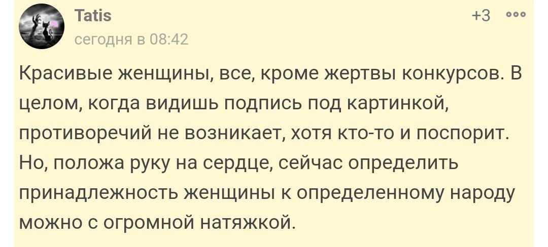 «Жюри конкурса явно пребывает в "замороженном" состоянии в плане представлений о понятии "Русская, русский, русское". Фанаты Лободы, видимо, - поклонники искусственного и безобразного, силикона и ботекса. Думаю, среди мужчин и женщин вряд ли наберётся 1% тех, кому такая "королева красоты" придётся по душе. А вот жюри выбрало эту девушку. Не знаю, какой возраст у членов жюри, но на лицо поколение Барби. Ни глазу отрада, ни сердцу приятность, увы.. Нет, я понимаю, закон инерции никто не отменял, но так хочется… как там Цой пел?… ПЕРЕМЕН… требуют наши сердца. Перемен требуют наши глаза.»