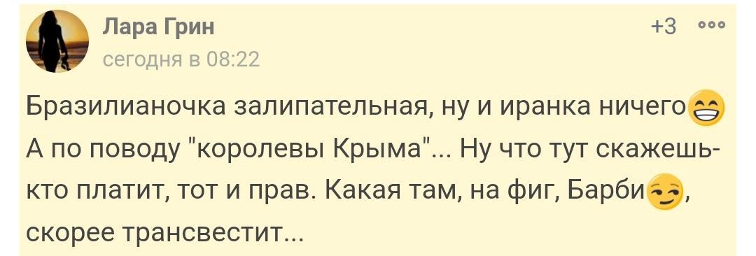 N.B. И в заключение хотел бы повеселить вас фотографиями недавней победительницей королевы красоты "Королева красоты — Крым. Весна - 2022" в России, Ольга Валеева.