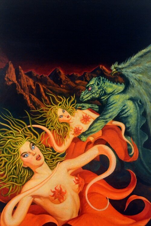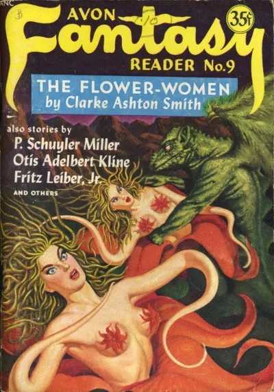 Основная же идея, как по мне, - это пейзаж и небо иного мира, другого измерения, куда переносится сознание лирического героя. И возможно (возможно!), это стихотворение относится к мини-циклу Кларкаш-Тона "Ксиккарф" (Xiccarph), куда входят два рассказа: "Женщины-цветы" и "Лабиринт Маал Двеба" (оба изданы в Weird Tales, в 1935 и 1938 гг, соответственно). Ибо там действие тоже происходит в мире трёх солнц (и пяти планет). Поэтому для картинки к посту воспользуюсь иллюстрациями к "Женщинам-цветам": чёрно-белая из Weird Tales - art by Vincent Napoli (c) и цветная с обложки Avon Fantasy Reader - art by Doug Ellis (c).