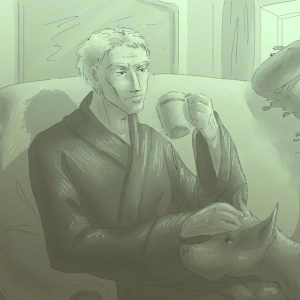 У него тут экзистенциальный кризис, нет сыра, коврика и работы. Зато есть чашка и песель, который на него преданно смотрит и надеется, что этого хватит. А еще у него мертвая ассистентка, которая превращается в Ктулху и жалуется, что куча людей умерли, и теперь ей рекламную кампанию придется перенастраивать. В общем, экзистенциального кризиса нет только у собачки. По-моему совершенно потрясающий портрет)))