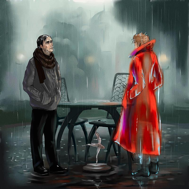 Физически ощутимый дождь. Физически ощутимый дискомфорт от, казалось бы, простого разговора. Мне нравится, что Марш стоит спиной и зритель, вместе с Джеем не знает, чего от нее ждать. Нет у нее никаких зубов, нет оружия, и вообще она мертвая - вон сквозь нее капли просвечивают и блики лиловые по голограмме ползают. Нужно просто наклониться, забрать статуэтку и пойти домой. Но домой он не пойдет, он умрет через мгновение. Дождь будет идти, Марш будет равнодушно смотреть, блики будут ползать по ее пальто, а человека, который стоит лицом к зрителю и пытается убедить себя, что бояться нечего - его не будет. По-моему это потрясающе. Спасибо вам, Ольга, я так много рассматривала эту иллюстрацию, что казалось до последней черточки запомнила. А сейчас открыла - и снова идет дождь.