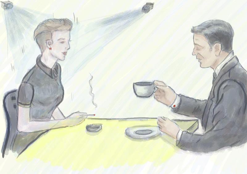 Каждая иллюстрация от Екатерины Близниной - событие. Ну посмотрите, какая прелесть. У Рихарда красные запонки, значит, он бессовестно врет, а, погодите-ка, он все время бессовестно врет. Но сейчас его еще и детектор лжи сдает. У Марш красные сережки - на нее детекторы вообще-то не действуют, потому что у нее не меняются физические показатели, когда она обманывает. Вон, сквозь руку стол просвечивает, это все ее физические показатели.