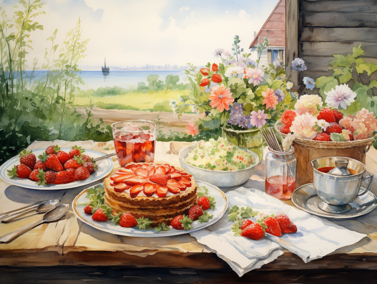 Традиционный стол на Мидсоммар является важной частью праздничной традиции и предлагает разнообразные блюда, которые символизируют обилие летнего сезона. Картофельный салат с яйцами, маринованными огурцами, луком и майонезом является одним из основных блюд на праздничном столе. Также стол украшает маринованная сельдь, пироги с клубникой, свежие ягоды, фрукты, лимонады, эль и шнапсы. Не менее важно наличие печёного и сладостей, чтобы весь последующий год был удачным, богатым и счастливым!