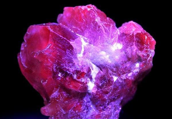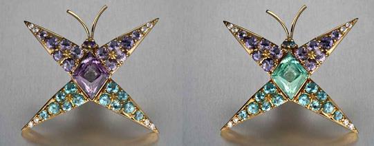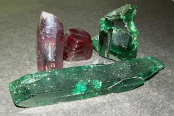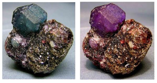 Днём он тёмно-зелёный, но при свете электричества, лампы или простой спички он загорается тёмно-малиновым цветом, а в лучах солнца кажется нежно-фиолетовым с синевато-зелёным отливом.
