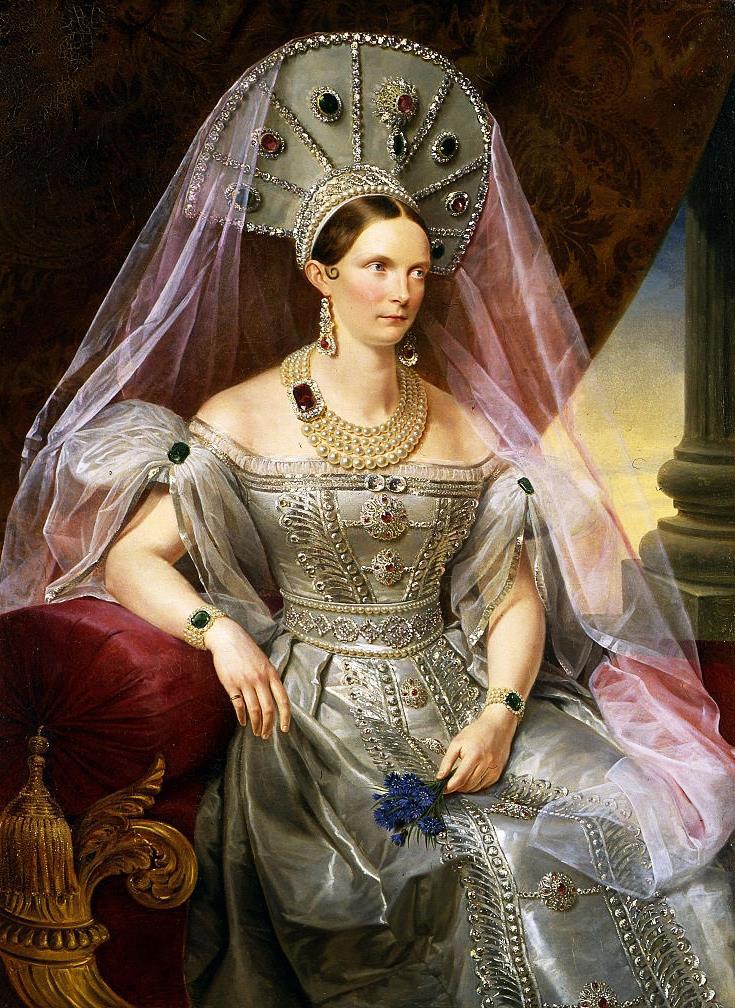 Статью эту писала очень давно, лет десять назад или даже раньше для группы Тёмная Башня. Возможно и тут она окажется кому-нибудь полезной. На портрете изображена Императрица Александра Фёдоровна, мать императора Александра II. Прусская принцесса Шарлотта, став супругой брата императора Александра I, Николая, приняла христианство под именем Александра Федоровна. Портрет работы Франца Крюгера (1836) изображает Александру Фёдоровну в "русском" платье. Удивительное по красоте платье - великолепный пример стилизации русского парадного костюма согласно последней моде того времени. Парадное старинное царское платье напоминает только орнамент выложенный жемчугом и драгоценными камнями. Дополняет этот наряд кокошник, украшенный огромными драгоценными камнями в обрамлении жемчуга и бриллиантов. Камни эти, те самые волшебные александриты.