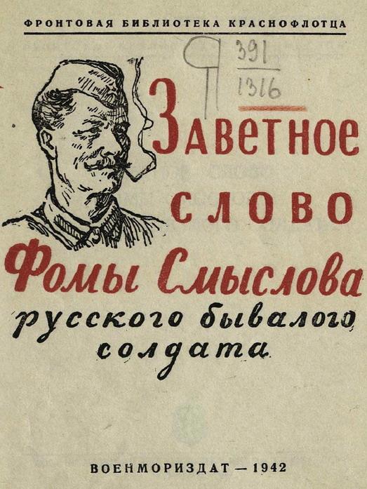 «Фома Смыслов — это образ русского солдата, каким он. стал теперь, после многих испытаний, выпавших на долю Красной Армии. Это кадровый солдат, вместивший в себя большой’ опыт войны, солдат; познавший и горечь временных неудач и радость могучего наступления. Он до конца свыкся с фронтовой «житухой»; крепко, как семью, полюбил солдатское товарищество, где все за одного и один за всех. Потому-то и стал образ Фомы Смыслова близок бойцам нашей армии. Некоторые выражения Смыслова стали лозунгами. Кто из бойцов не знал этих крылатых слов: