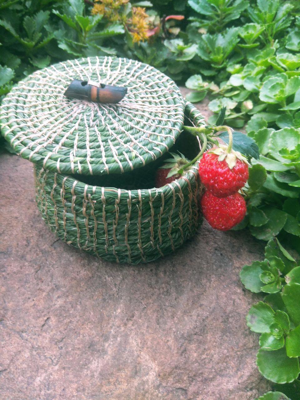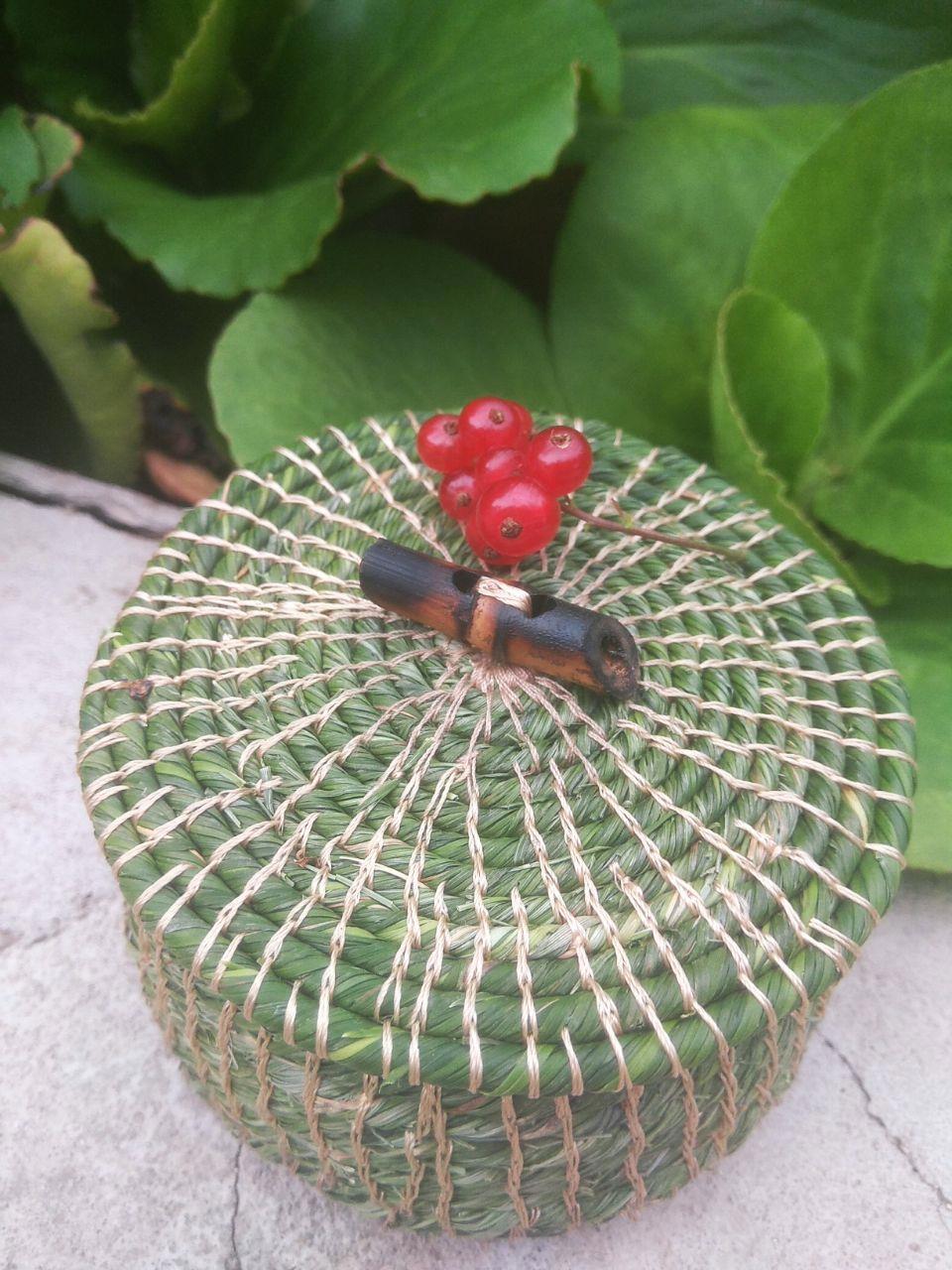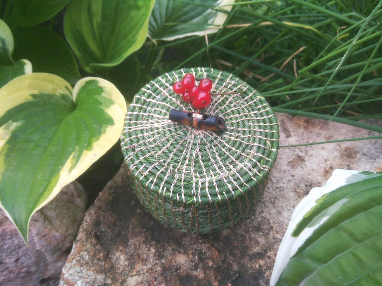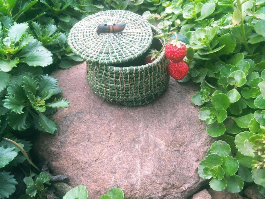 Вышла шкатулочка довольно крупная, с кружку величиной. Ручка на крышке из обломка тростника. Как оказалось, он неплохо прожигается и обжигается. Клубника настоящая.
