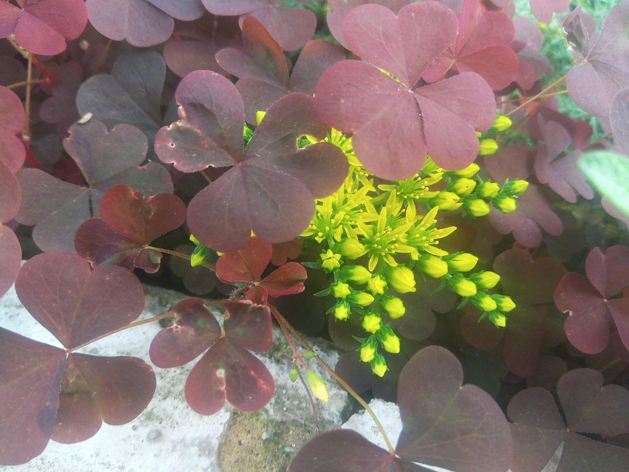 Вот, например, очиток распустил свой цветок в листьях кислицы:
