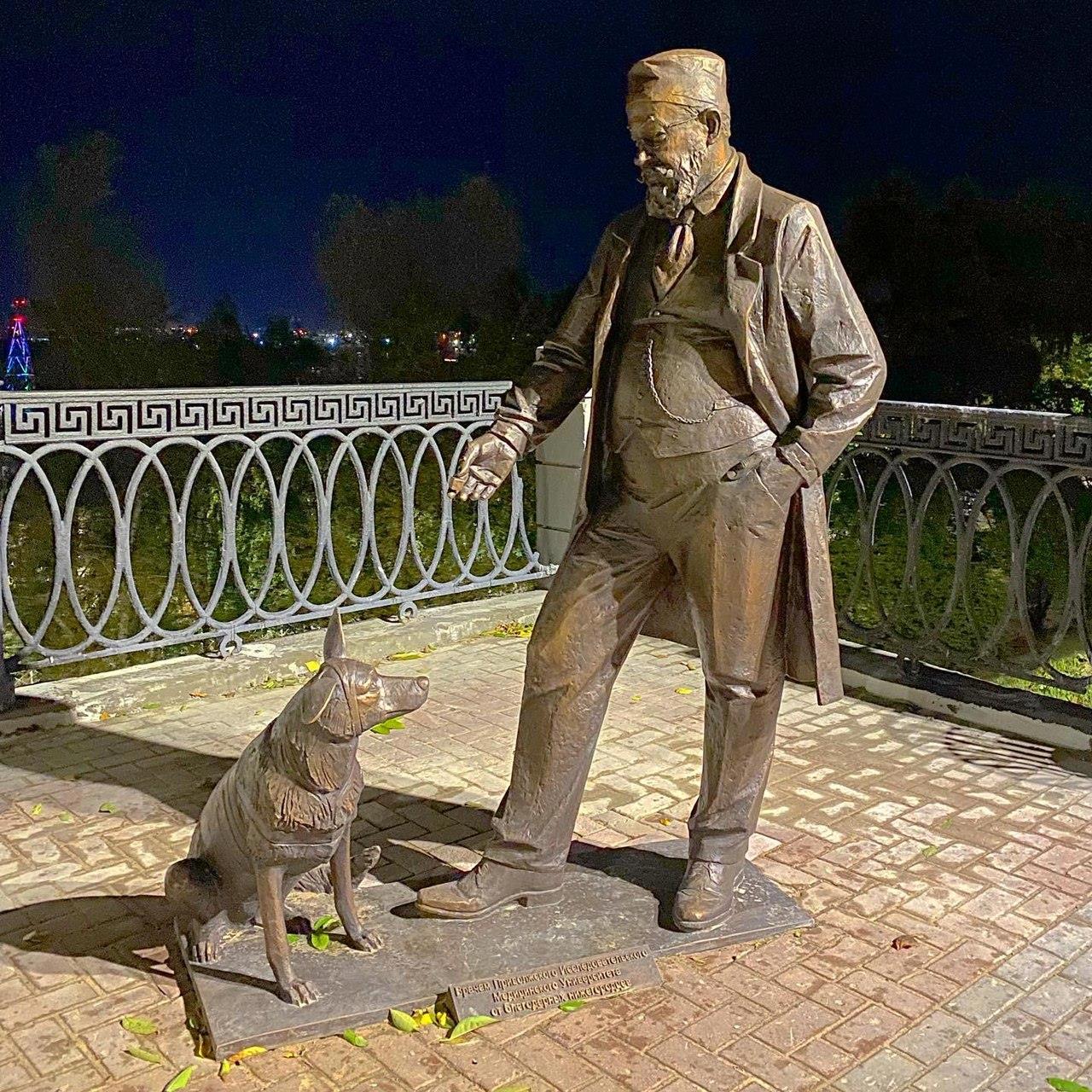 Скульптурная группа, изображающая профессора Преображенского (в исполнении Евстигнеева) и пса Шарика напротив медицинского учреждения в Нижнем Новгороде.