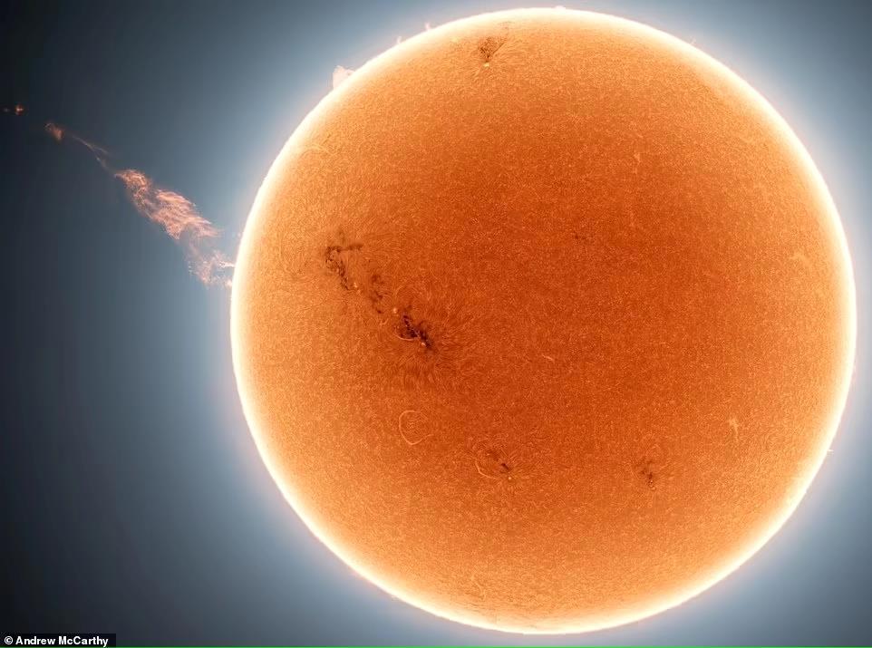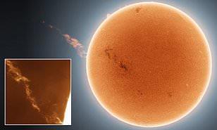 Колоссальный шлейф длиной в миллион миль, вырывающийся с поверхности Солнца, запечатлен астрофотографом: потрясающее изображение показывает светящийся поток плазмы, который двигался со скоростью 45 000 метров в секунду, улетая в космос.