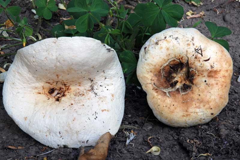 Но о пиператусе позже. Начнем с груздя войлочного, более известного под названием скрипица (Lactarius vellereus). Крупный гриб белой окраски, воронковидная шляпка во взрослом состоянии имеет диаметр до 25 см (встречаются и крупнее) и обычно капитально вымазана в земле: растет скрипица медленно и ножка у нее очень короткая (3-5 см). Края обычно неровные, волнистые, без опушения, сначала завернуты внутрь, но довольно быстро расправляются. Если провести по поверхности шляпки твердым гладким предметом, можно услышать скрип (а можно и не услышать), за это скрипица и получила свое название. Пластинки редкие, толстые, желтоватые (характерный признак), нисходящие на ножку, мякоть толстая, белая, плотная и крепкая, запах слабый, довольно неприятный (напоминает вяленую рыбу), либо грибной или почти отсутствует (еще один характерный признак — с запахом толковых груздей ничего общего). Скрипица почти всегда оказывается не интересной червям и улиткам. Млечный сок белый, не меняющий цвета на воздухе, неедкий — с вяжущим или горьковатым вкусом.