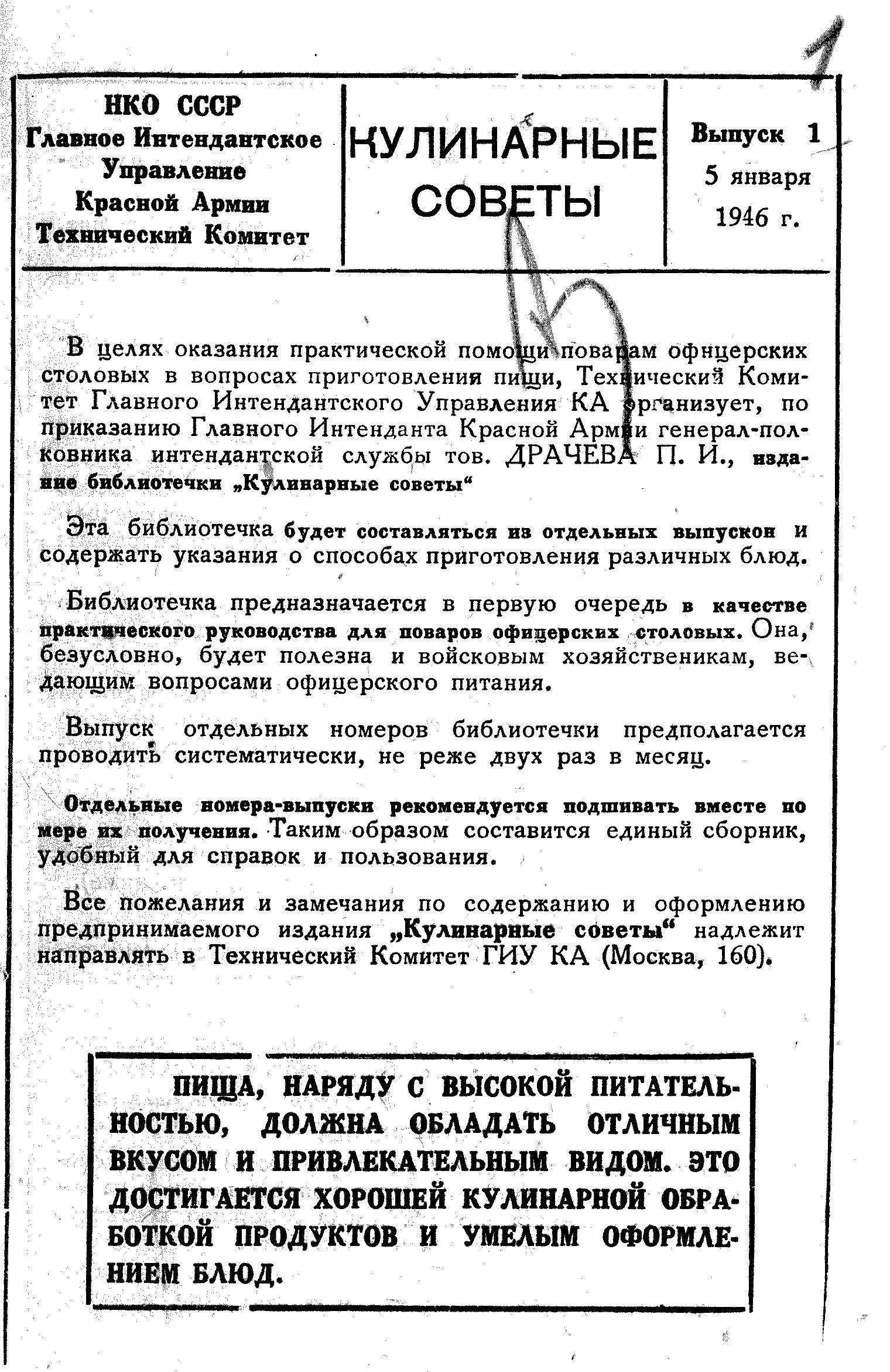 После войны, по приказу Главного Интенданта Красной Армии генерала П.И. Драчёва, эта работа была продолжена. Первый обзор, под названием "Кулинарные советы", вышел 5 января 1946 г. Большинство рецептов предназначались для поваров офицерских столовых. Всего было издано чуть больше двадцати экземпляров, и в 1947 г. выпуск "Кулинарных советов" прекратился.