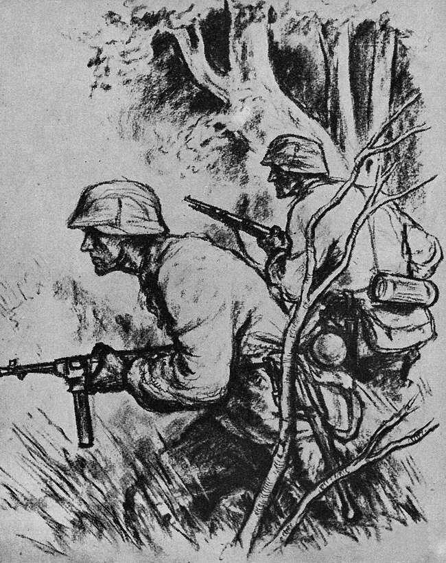 Схватив свою винтовку, я плюхнулся на землю, и скоро сквозь просветы между кустами выхватив ближайшего немца, нажал на спуск. От отдачи, моя, ещё не полностью зажившая рана, отозвалась дичайшей болью, аж чёрные круги поплыли перед глазами. Но я был к этому готов, и ожидал даже гораздо худшей реакции. Попал, не попал - не знаю, но все враги залегли с перепугу, и у нас появилась возможность слегка отлежаться да осмотреться, пока те поймут откуда стреляли, и посекут нас из автоматов. Я окончательно оклемался и даже попытался по старой памяти организовывать оборону.