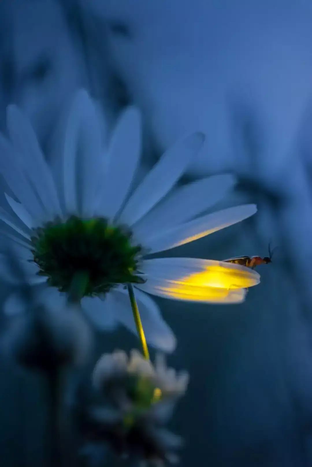 Светлячок сидит на ромашке.