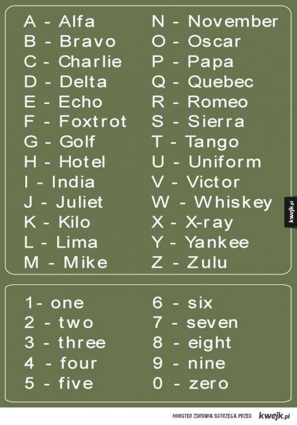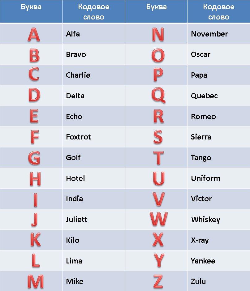 Фонетический латинский алфавит. Используется в Авиации ( и не только) при голосовых переговорах для однозначного интерпретирования алфафитно-цифровых идентификаторов.