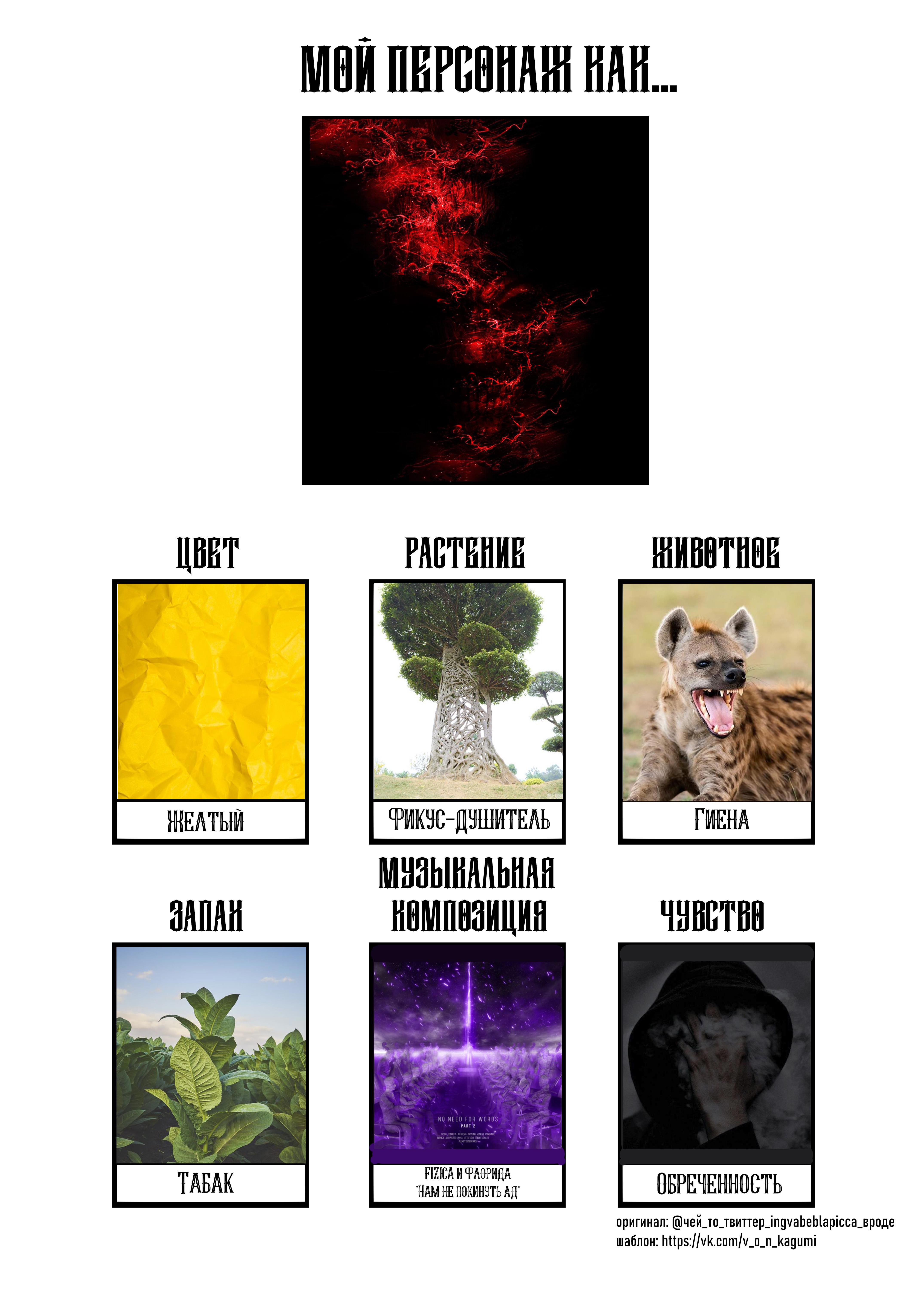 Растение подстать Фэнгэю. Фикус-душитель. Красивое, но опасное растение оплетающее ствол дерева. Если вовремя не убрать, то лишает дерево воды и питательных веществ, отчего то умирает. А вот если животное, то гиена. Неуместный шум, веселье? Это все Фэнгэй. Хитрость и обман? Также олицетворение жрецов Бомоа. С улыбками и плясками они выменяют вашу душу на сущий пустяк, а после уведут в свиту своего лоа. Так себе сделка, верно?
