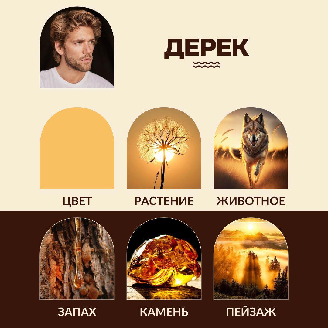 С Дереком у меня ассоциируется солнечный тёплый свет, одуванчик (совершенно неубиваемый цветок, способный прорваться сквозь любые преграды и расцвести ярким солнышком), волк (собака-то собака, но кусаться умеет еще как), запах древесного среза со смолой, янтарь и рассветный пейзаж.