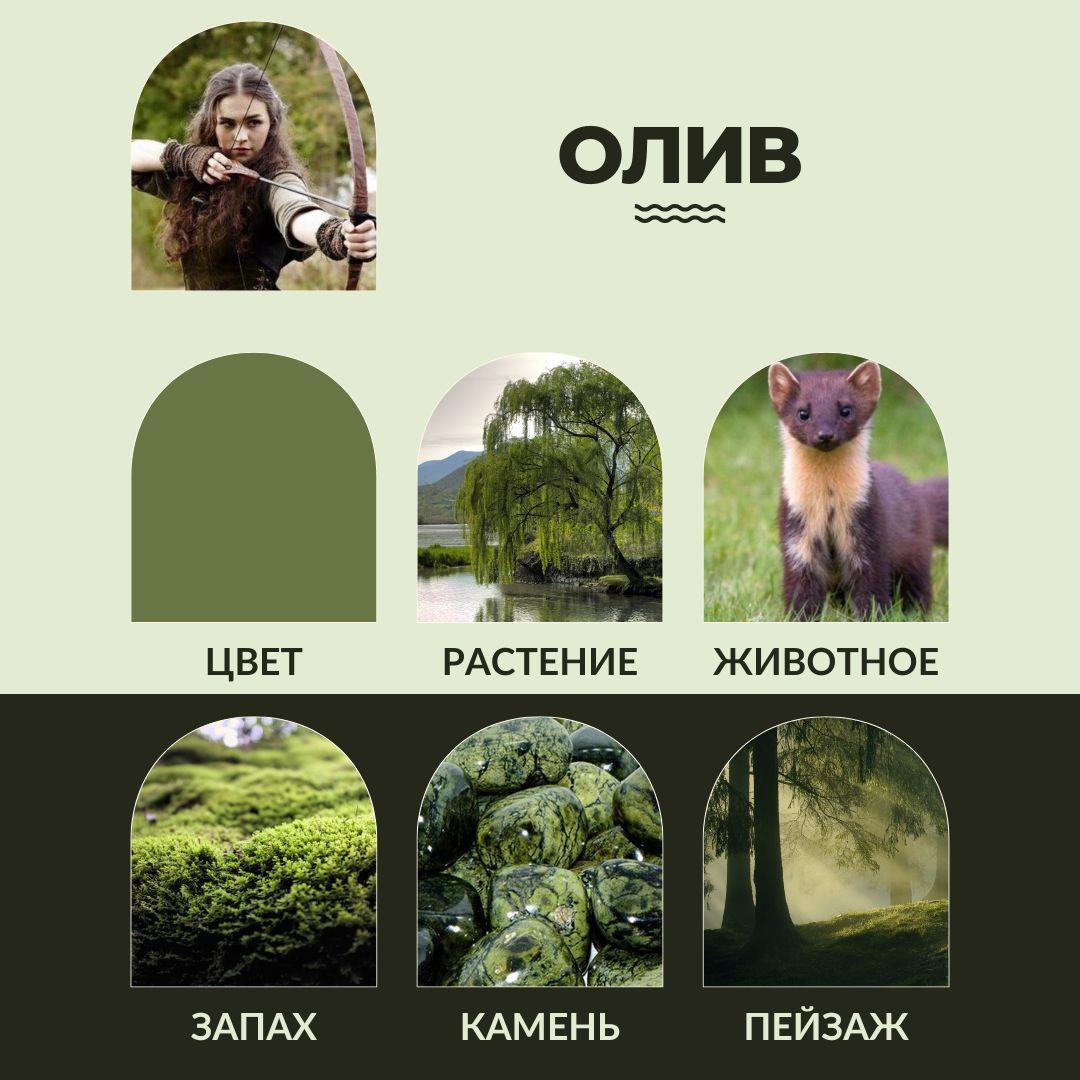 Олив - лесной болотный цвет, плакучая ива, хитрая куница, запах лесного мха, зелёная яшма, туманный лесной пейзаж.