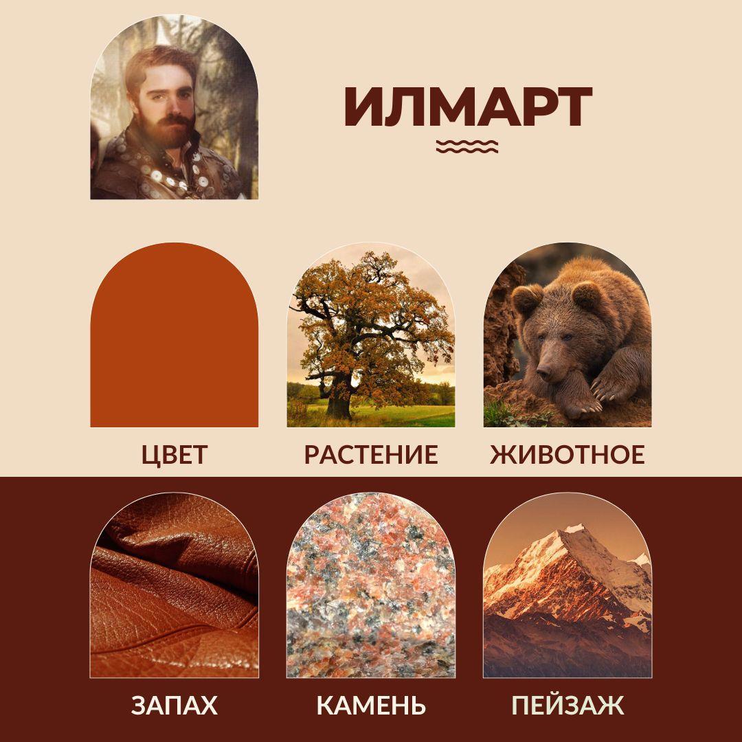 Илмарт - кирпично-оранжевый, могучий дуб, мощный медведь, запах кожи, гранит и горные массивы.