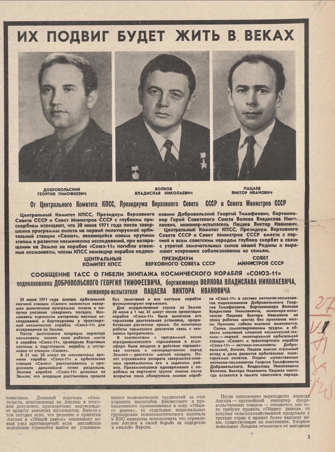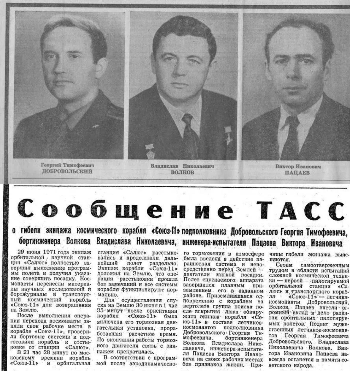 Я же хочу рассказать о другом, трагедии с космическим кораблем "Союза-11, произошедшей 30 июня 1971-го года