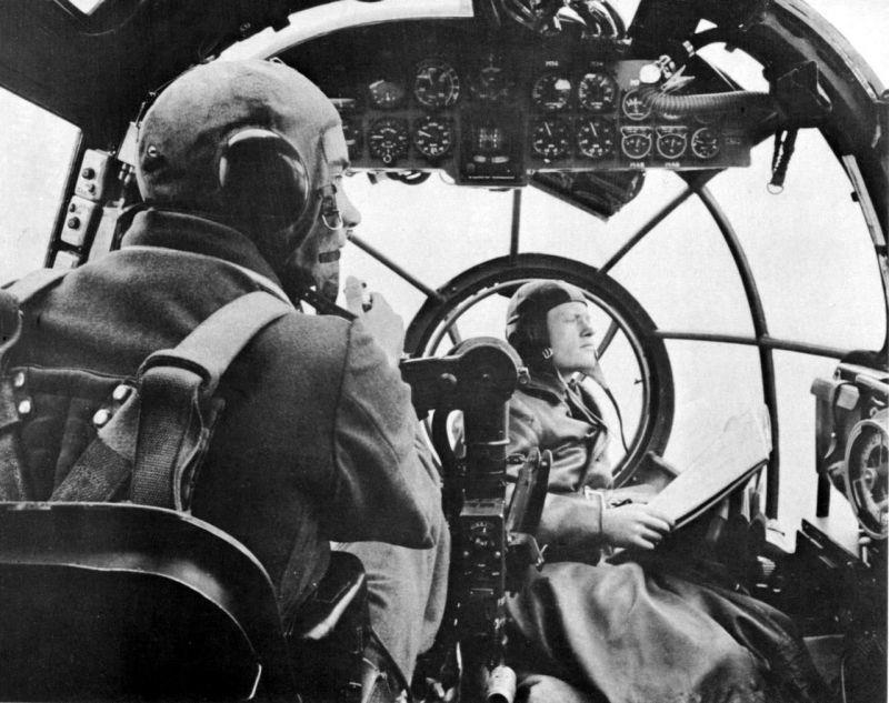 В кабине бомбардировщика Хейнкель He-111 во время боевого вылета на бомбардировку Великобритании. 1940 г.