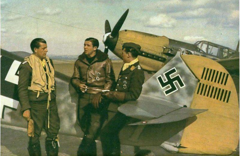Летчики у своих самолетов Мессершмиттов BF.109E на аэродроме Кокель в оккупированной Франции. Август 1940 г.