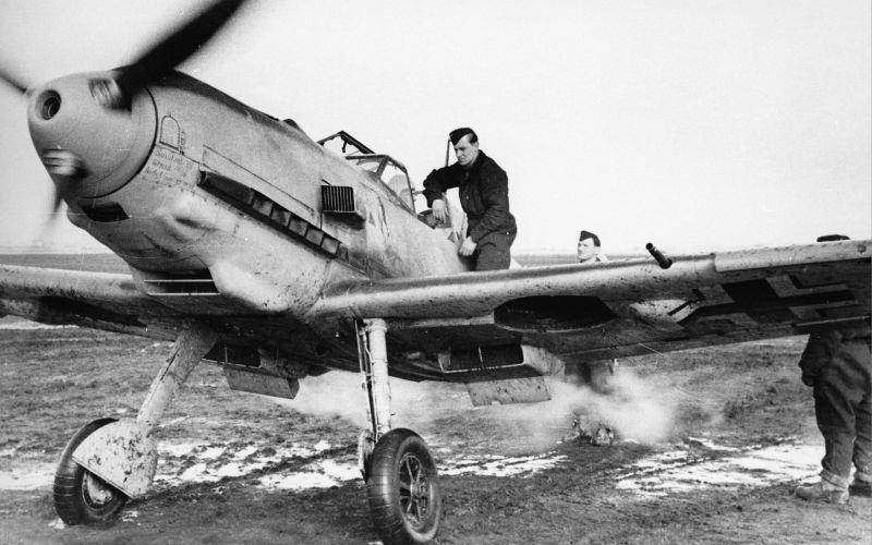 Истребитель «Мессершмитт» Bf-109E-3 перед вылетом на аэродроме в Норвегии. Апрель 1940 г.