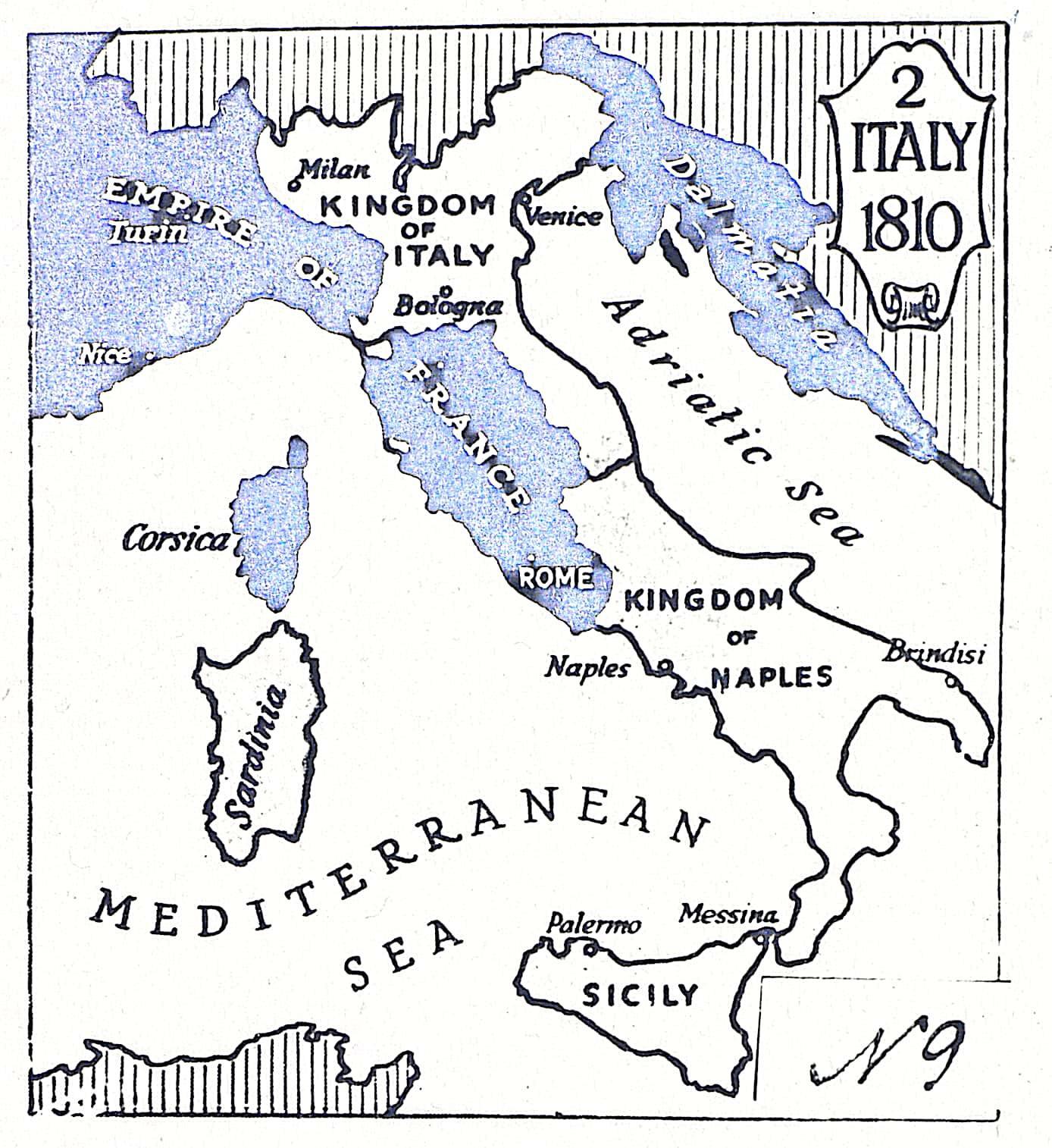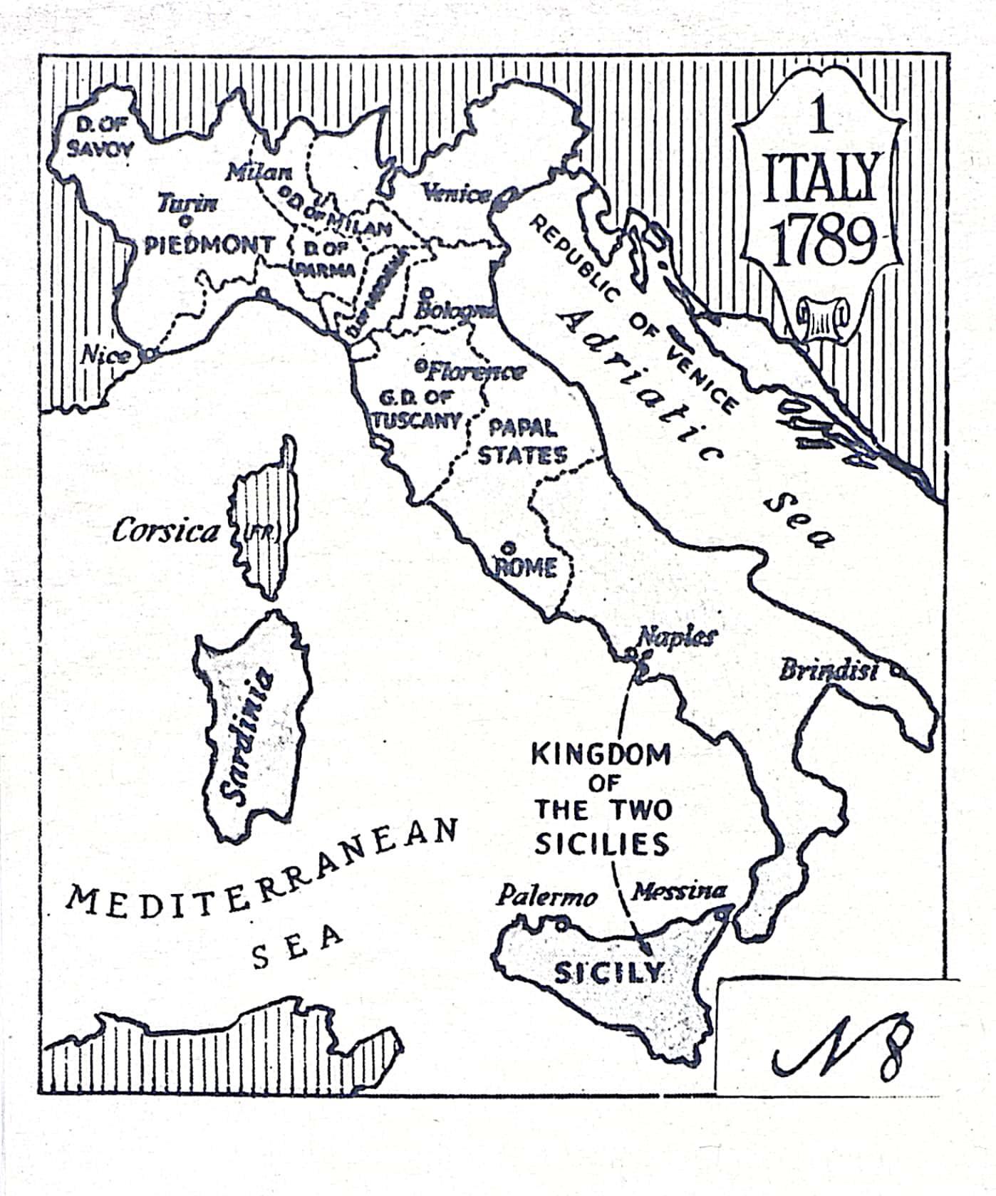 В таком положении Италия находилась до Великой французской революции. С приходом Наполеона обстановка начала изменяться в благоприятную для Италии сторону. При Наполеоне французы полностью завоевали Италию. Безусловно, это означало только смену хозяев, но эта смена была к лучшему. При Наполеоне управление Италии значительно улучшилось. Наполеон заявил: «Я сделаю народ Италии единой нацией». Хотя ему не пришлось дожить до осуществления своей мечты, тем не менее посеянные им зерна дали в конечном счете плоды в период генерала Гарибальди-«освободителя» Италии. В июне 1861 года Италия стала, наконец, свободной нацией, когда король Виктор Эммануил создал свое правительство в Риме и организовал парламент.