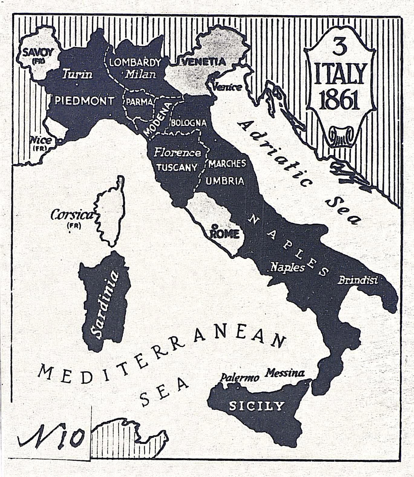 Со времени падения Римской империи до конца 19 столетия не было ни одного периода в истории, когда бы Италия могла себя считать в политическом смысле нацией. Италия не существовала кроме как географическое название для определенной части Европы.