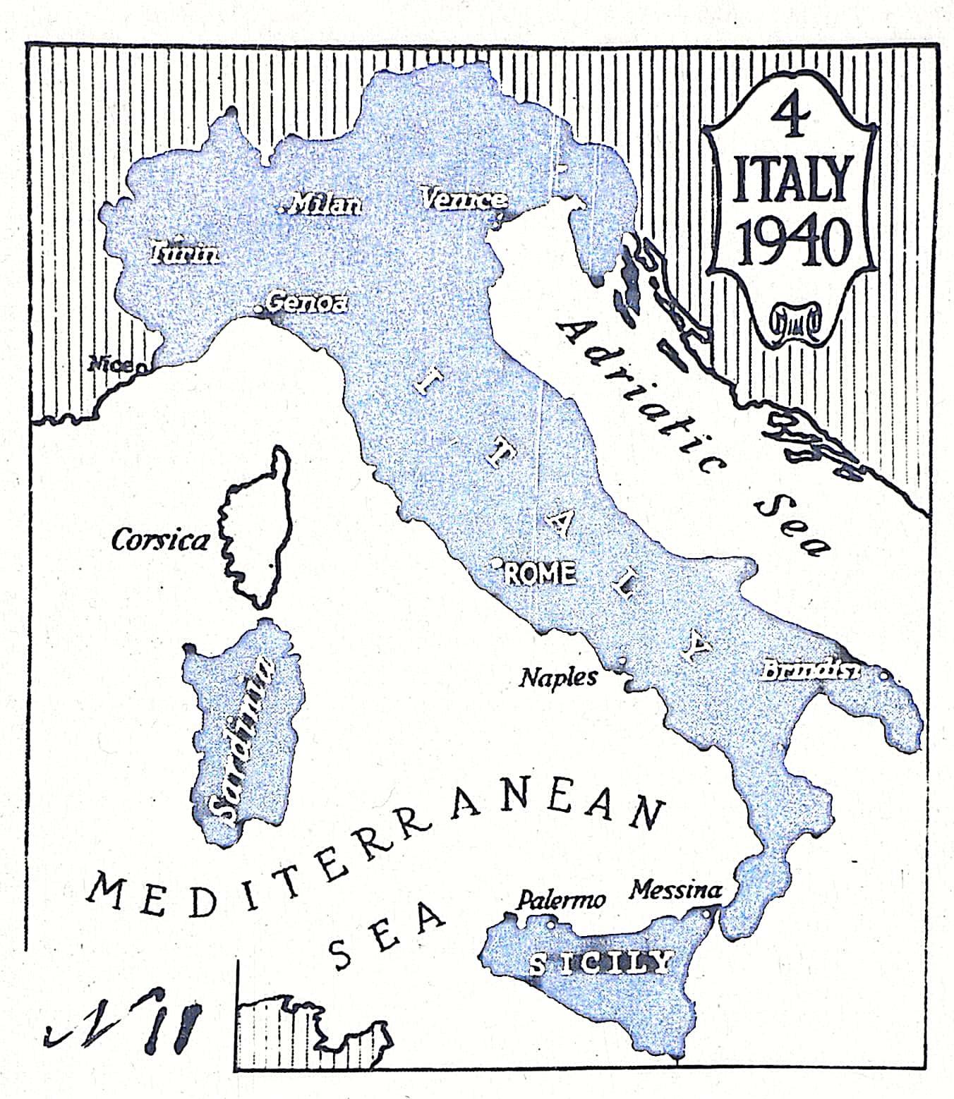 Лидер фашистской партии Муссолини приобретал все больший вес и, наконец, в 1922 году от получил от парламента диктаторские права. С того времени Муссолини неизменно находится у власти. Теперь, в 1940 году перед Италией вновь возникли опасности. Когда в сентябре 1939 года вспыхнула война, Муссолини благоразумно решил остаться нейтральным. Если бы Италия осталась нейтральной до конца войны, весь мир отметил бы ее благоразумие. Но в июне этого года Муссолини поразил весь мир, объявив войну Франции в тот самый момент, когда эта страна переживала тяжелые дни в результате сильных атак Германии. Самонадеянный, в результате 20 летнего пребывания у власти, увлекшийся тщеславной идеей создать вторую Римскую империю Муссолини поддался соблазну, благодаря своей жадности и тщеславию, разделить плоды грабежа до того, пока не станет слишком поздно.