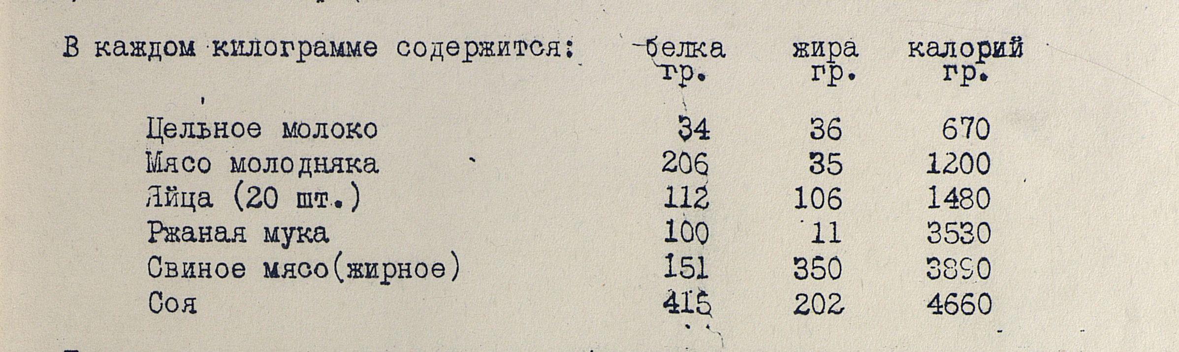 Народу, стоящему под угрозой нехватки питания, не остается другого пути, кроме как возвращение от мясной пищи к пище растительной. К этому привели также и военные соображения, трудность сохранения продуктов животноводства и большие издержки при их транспортировке. Все это облегчается наличием соевых бобов, которые обладают большим процентом белка. Высокая питательность соевых бобов иллюстрируется следующими цифрами: