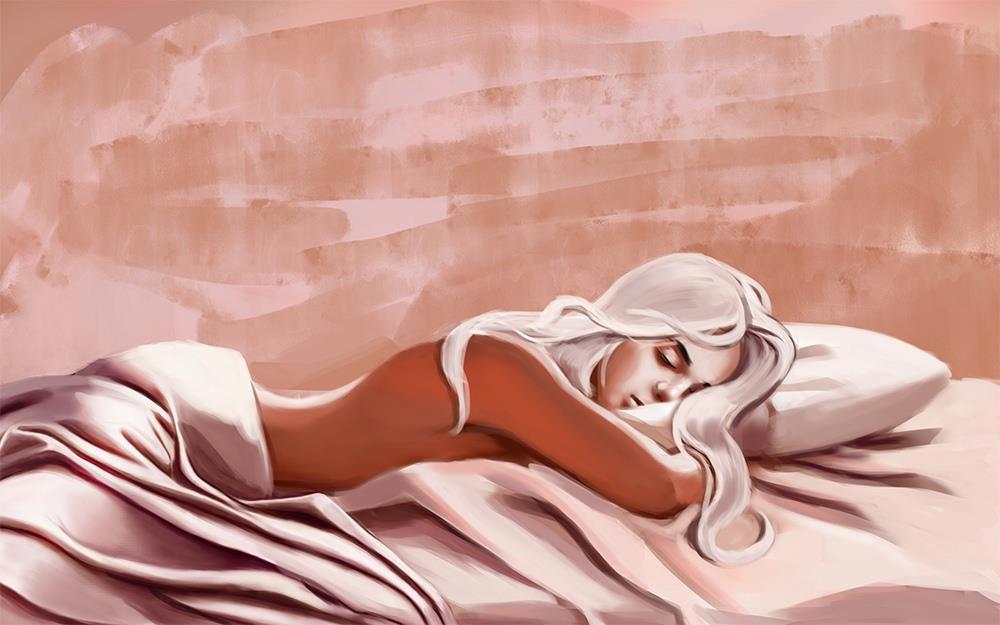 На Женьке полупрозрачный ядовито-зелёный шёлковый халатик, она начинает его расстёгивать: первая пуговка — выглядывает левая грудь в кружевном голубеньком лифчике, затем — правая. Девушка поводит плечами, халатик начинает съезжать, затем, ещё две пуговицы и он падает окончательно позади неё. Лифчик имел застёжку между чашечек, освободившись, крылышками распахивается в стороны, ещё движение, и он падает поверх халатика. Дерзкий взгляд исподлобья, руки опускаются к трусикам. По паре сантиметров поочерёдно, красотка сталкивает их себя то справа, то слева.
