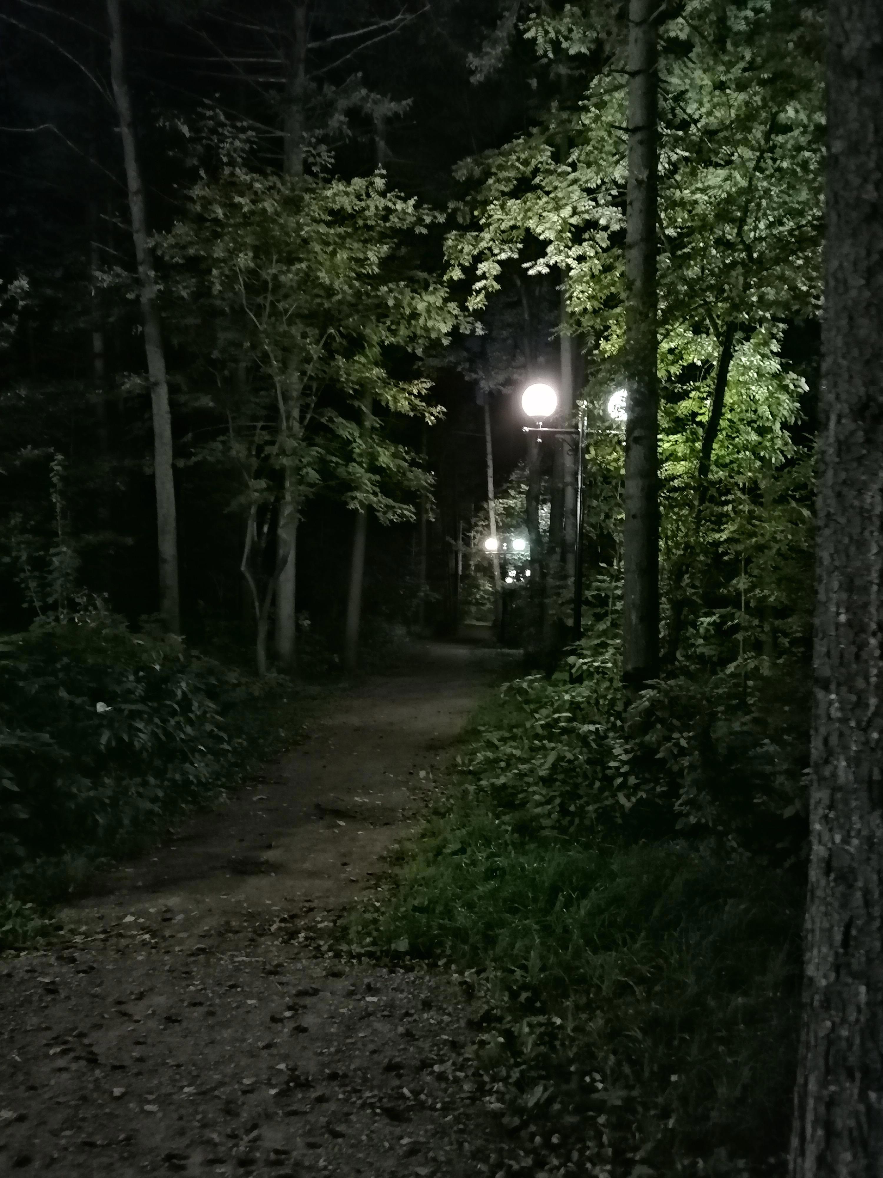 смело озирался по сторонам, не отходя дальше полутора метров, пока не сказала ему "не бойся, я с тобой". Лес, тьма, жуткая жуть)) "куда ты меня завела хозяйка в ночь?!"