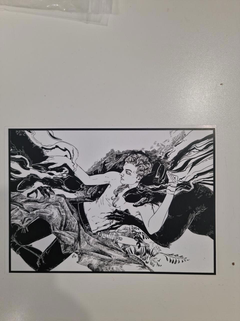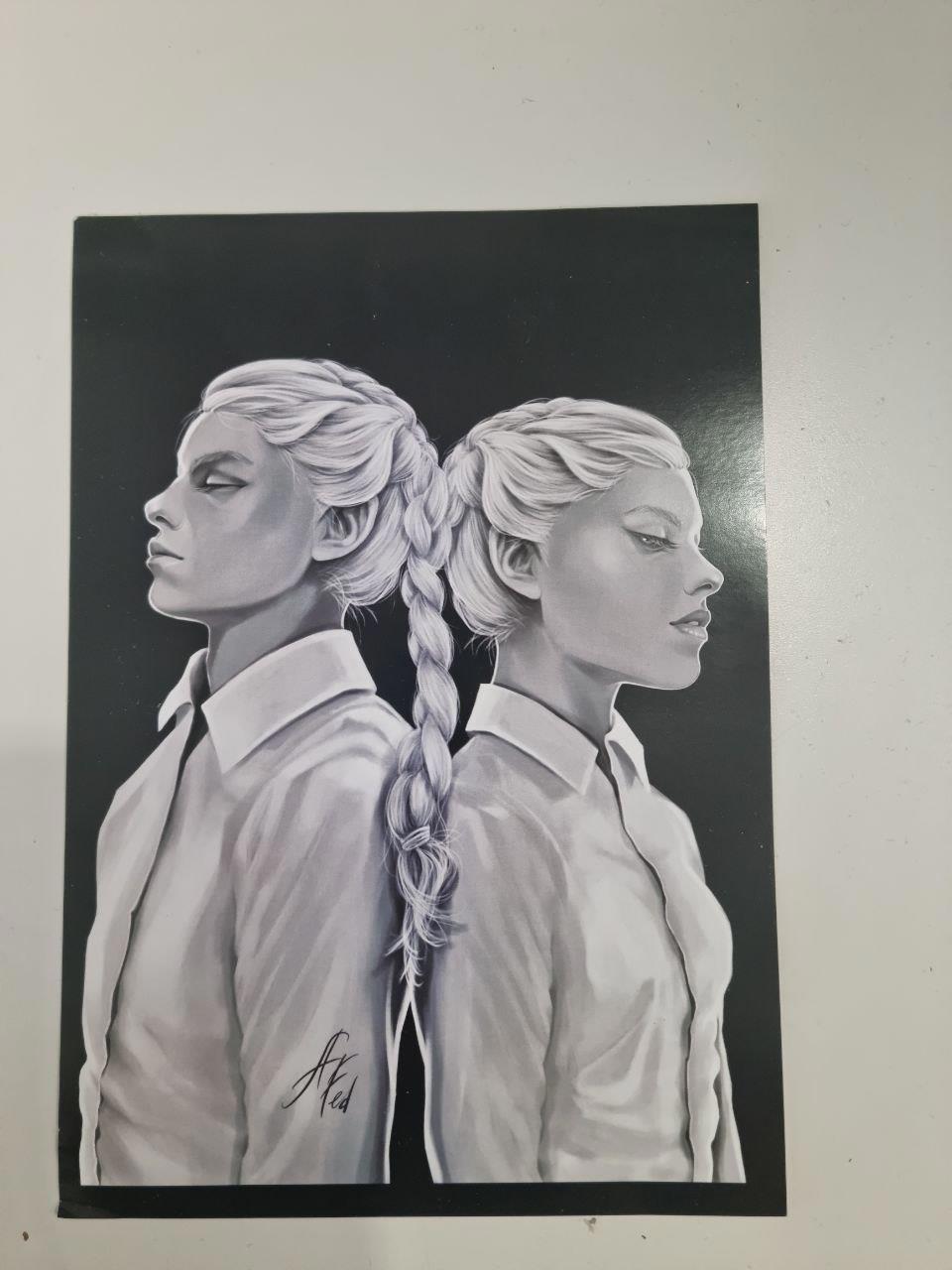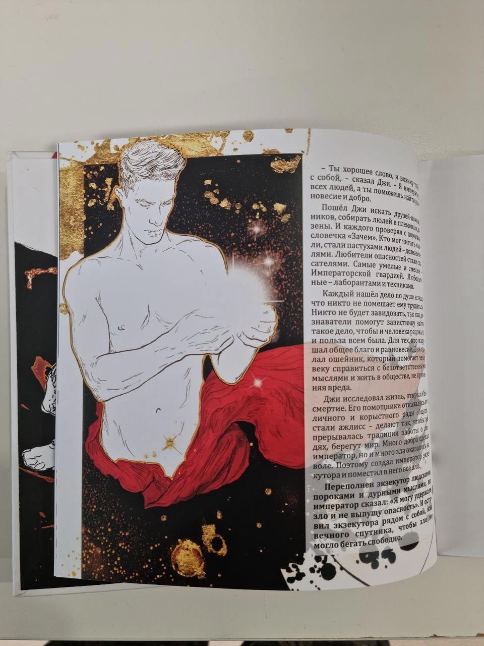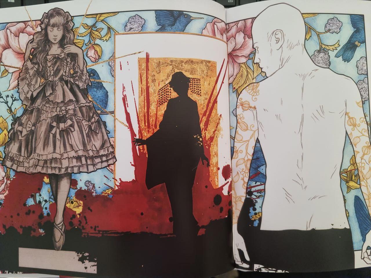 Артбук я не еще читала (я тоже не дочитал ещё XD), но с первого взгляда поразил визуал. Хочется рассматривать детали, и узнать историю изображенных героев. Очень круто работают в связке простые, черно-белые наброски и геометрия цветных компонентов. Изображение ниже настолько заворожило, что теперь я представляю его в интерьере нашей гостиной.