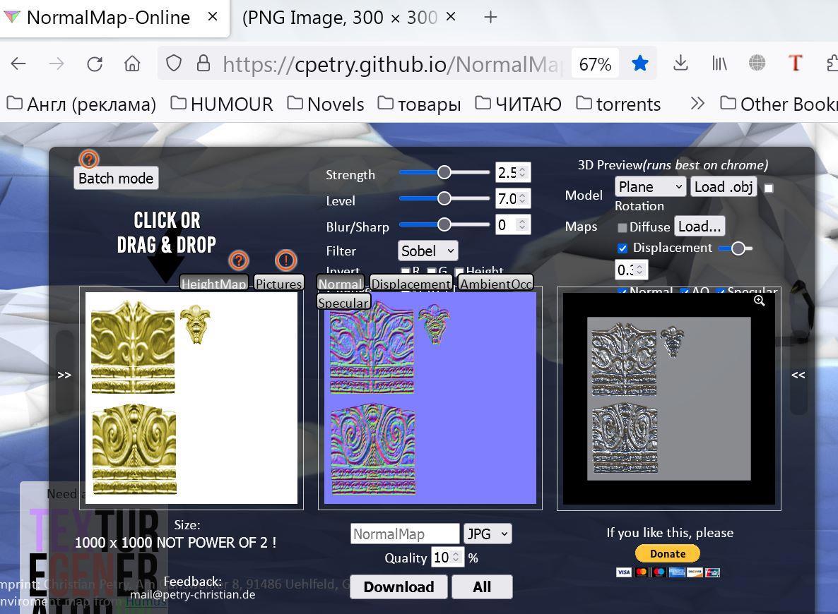 добавим для объемности нормаль-карту, которую изготовим по фактуре с помощью онлайн-мастерской "Normal map online". Вот такую (голубенькая):