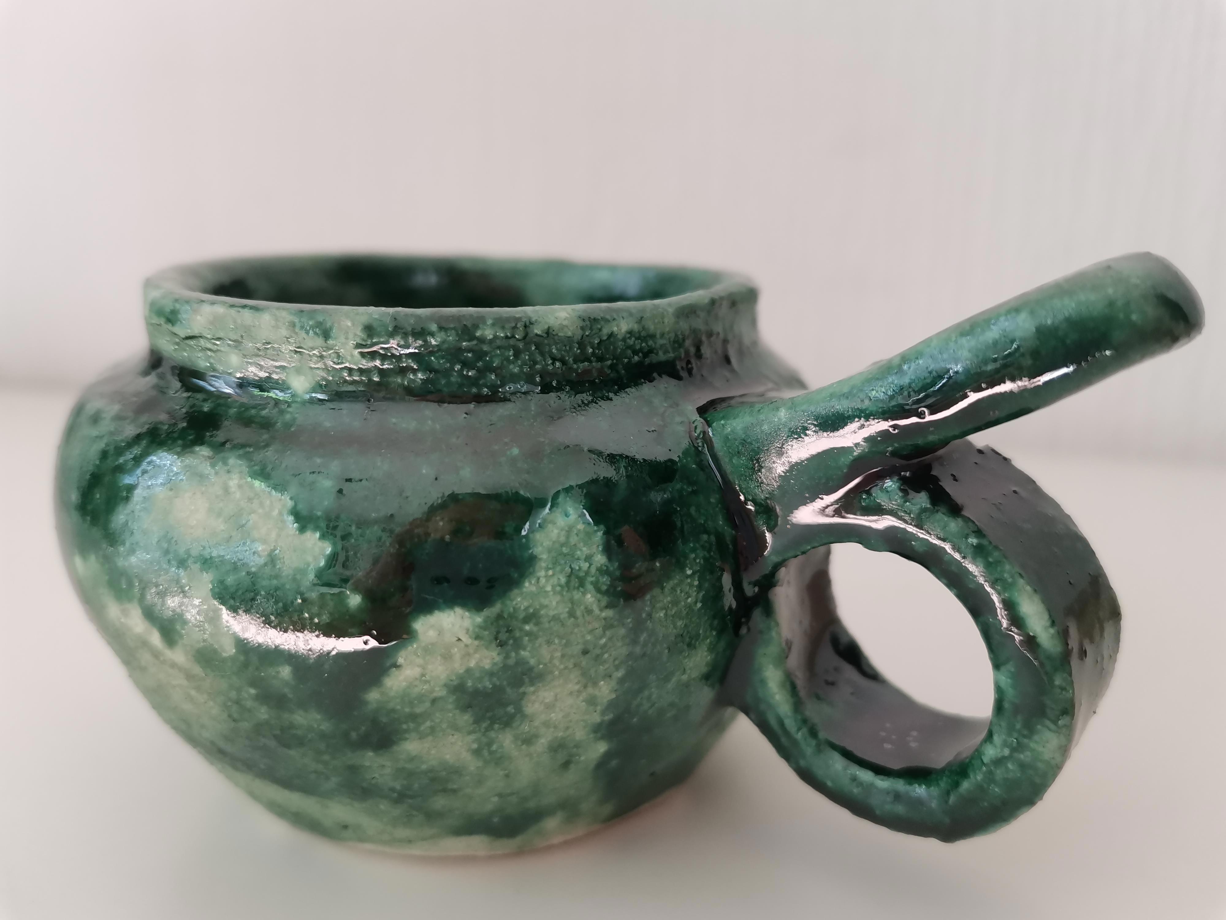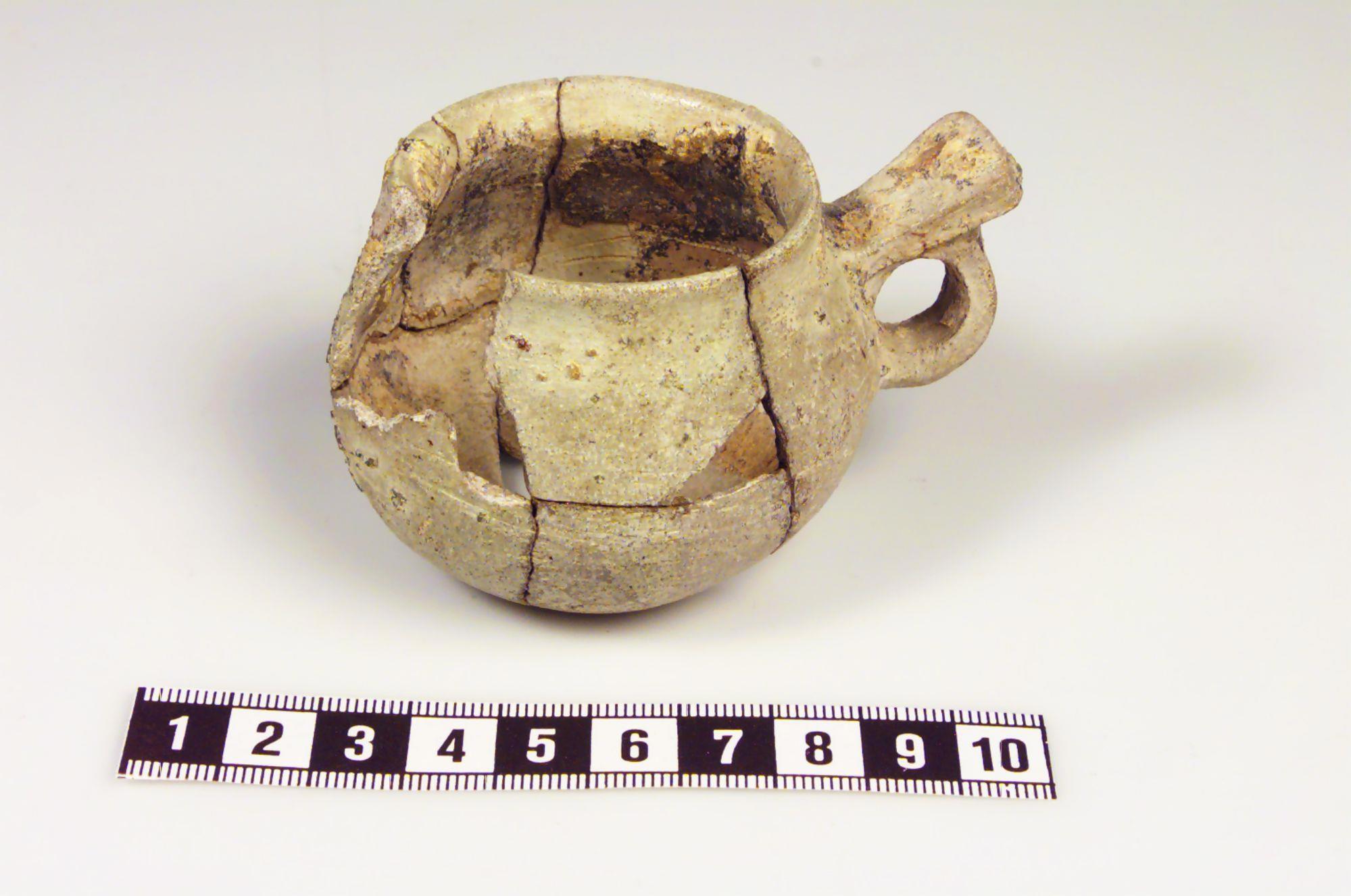 Описание чашки (археологической находки): Чашка датируется X-началом XI вв., т.е. относится к эпохе викингов. Эта чашка имела высоту около 5 см, а диаметр ее тулова составлял 6,3 см. Чашка была сделана из светложгущейся (белой) глины с примесью песка и покрыта свинцовой глазурью (вредной, между прочим) предположительно светло-зеленого или оливково-зеленого, или же темно-зеленого цвета (описание глазури – Л. Тюнмарк-Нюлен). Глазурованное покрытие сохранилось плохо, как и сама чашка.