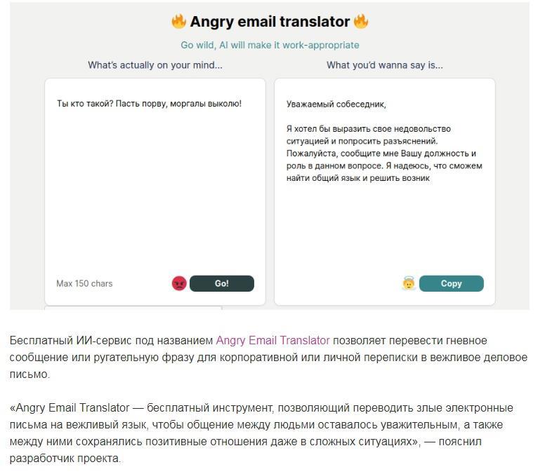 Автор: Тишуков СергейВ последнее время что-то появилось много нападок на нейросети. Как по мне, так от них масса пользы. Вот, например, новая опция от Angry Email Translator.