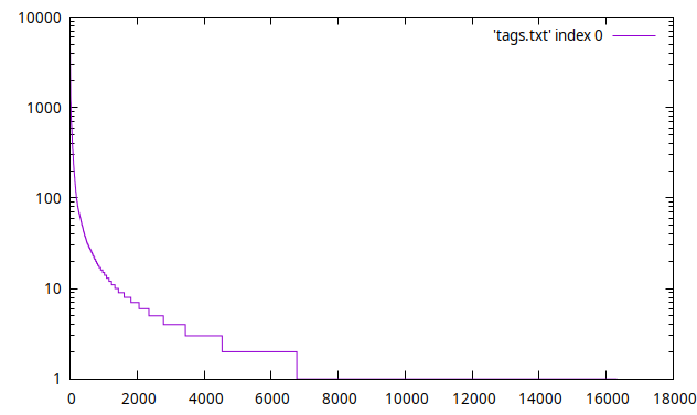 upd. Пример распределения тегов, отсортированных по частоте (в выборке из 40тыс книг). Вертикальная шкала "частота" - логарифмическая: