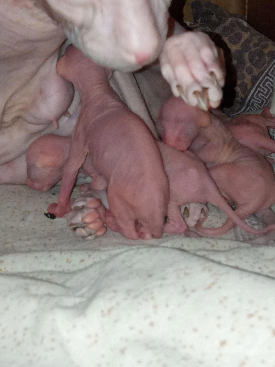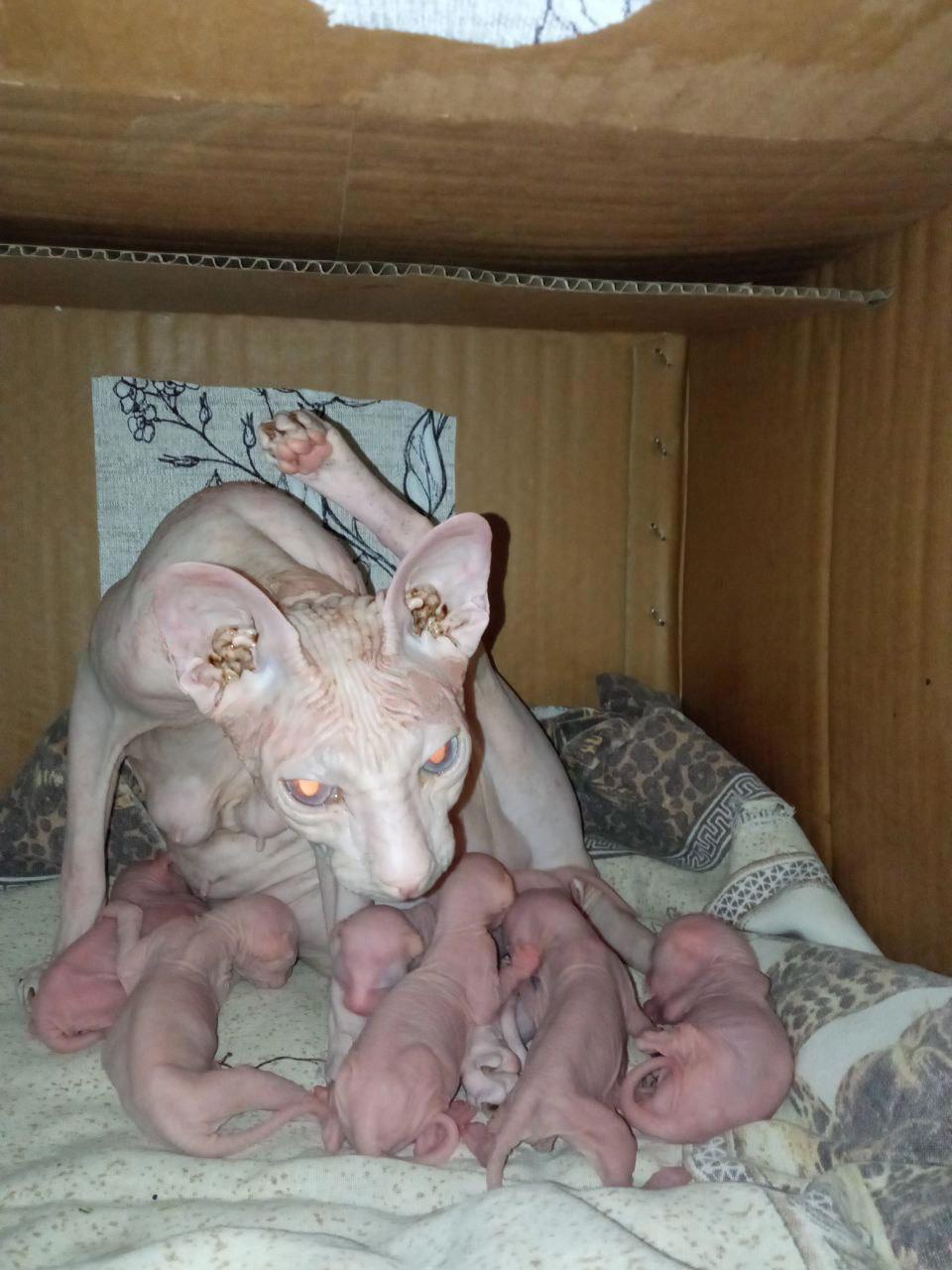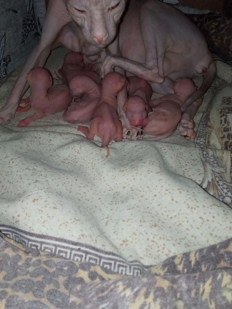 Автор: Lixta Crack (Λιξτα Κρεκ)Вчера вечером Сима родила шесть штук котят. Смотрите, какие страшненькие лысики получились)