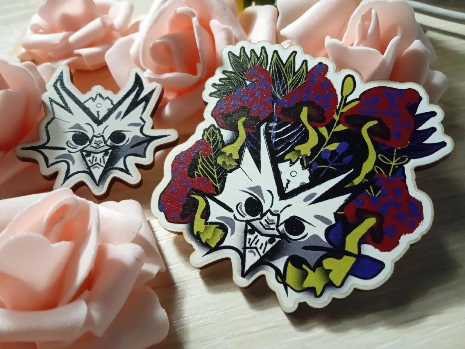 Ну и куда же без создания своего мерча. Создала значки с черепами и магниты с драконьими глазами, так же применяю свои дизайны на мокапы одежды и сумки
