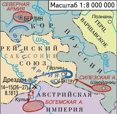 Автор: fales11 августа 1813 года Австрия объявила Наполеону войну присоединившись к России и Пруссии.Наполеон потерял превосходство в силах – теперь у союзников в Германии было примерно полмиллиона войск, а у Наполеона 400 тысяч. План союзников заключался в том, чтобы наступать с нескольких сторон, уклоняясь в то же время от сражений с главными силами Наполеона. Пользуясь тем, что Наполеон увел основные силы против силезской армии Блюхера, огромная богемская армия союзников (состоявшая из австрийских, русских и прусских войск) перевалив через Рудные горы, начала наступление на базу снабжения Наполеона – Дрезден. Однако к 26 августа (когда армия союзников появилась под Дрезденом) французы успели укрепить Дрезден и отбили атаки, а неожиданно появившийся под Дрезденом Наполеон 27 августа атаковал австрийские части генерала Меско, и разбил их наголову (остальная армия союзников не могла прийти на помощь из за рельефа местности и проливного дождя). Армия союзников, преследуемая французами, начала спешное отступление назад в Богемию.