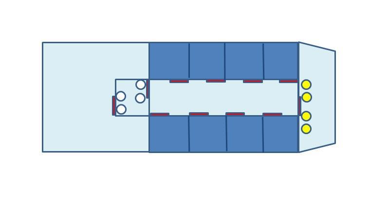 Красные прямоугольники — гермодвери-слайдеры. В данном случае штурмовая группа белых вошла через шлюз поскольку гермолюк в любом случае проще вскрывать чем цельный полиэтиленовый монолит. Кроме того, можно использовать грузовые люки трюма, но для взятия контроля над кораблем в любом случае придется идти через шлюз и центральный коридор в командный отсек. Либо взрывать стенки кают и санузла, либо гардероба, что долго и заметно.