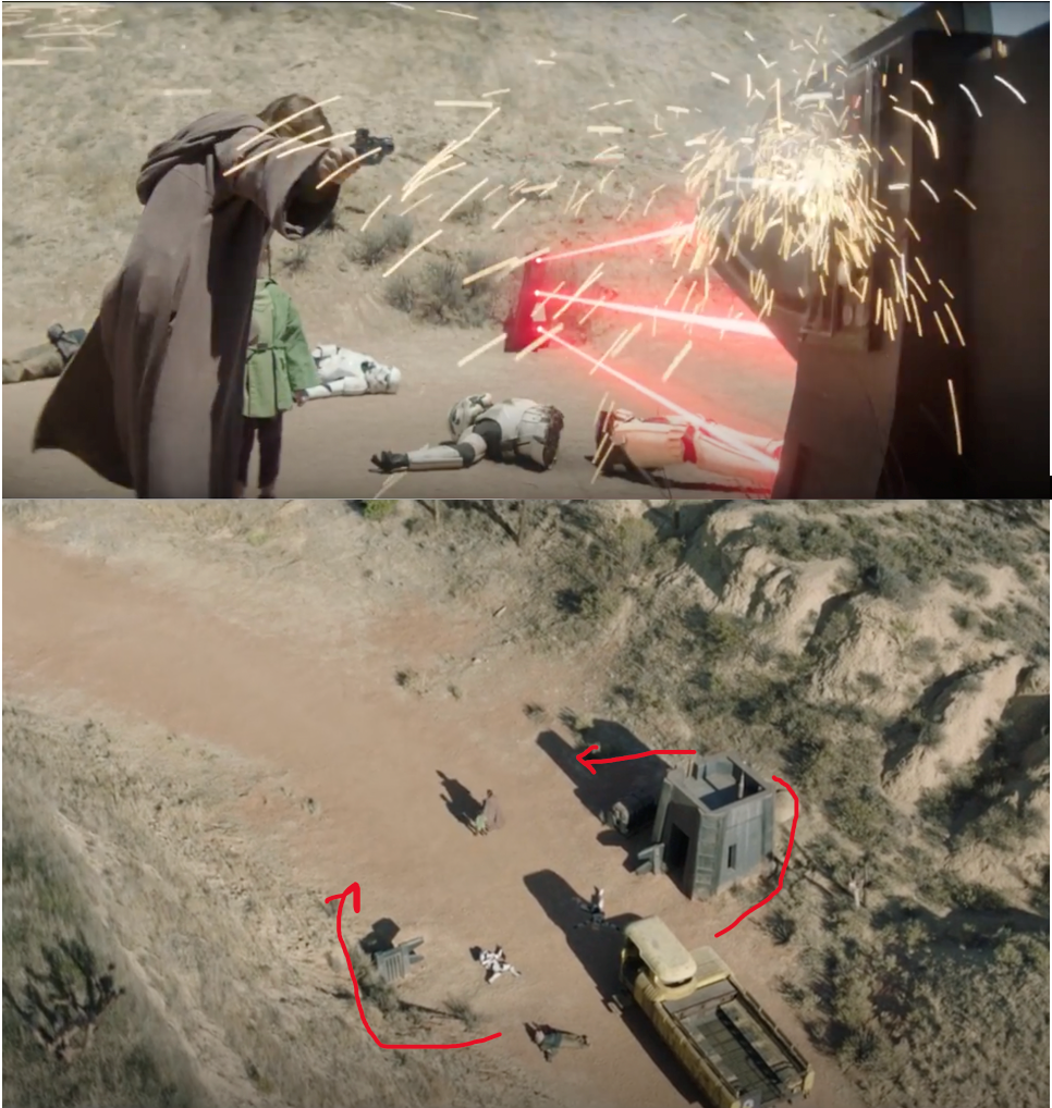 Кеноби мог обойти лазерные ворота, но вместо этого он деактивировал их выстрелом из бластера и пошёл по дороге дальше. Логика? Не, не слышали! Видимо, в сценарии предполагалось, что ворота эти будут находиться в каньоне или в ущелье. Вот только из-за ковидной самоизоляции забыли нарисовать это самое ущелье. А потом, когда увидели на монтажном столе готовый результат, решили оставить, как есть, мол пипл и так схавает.