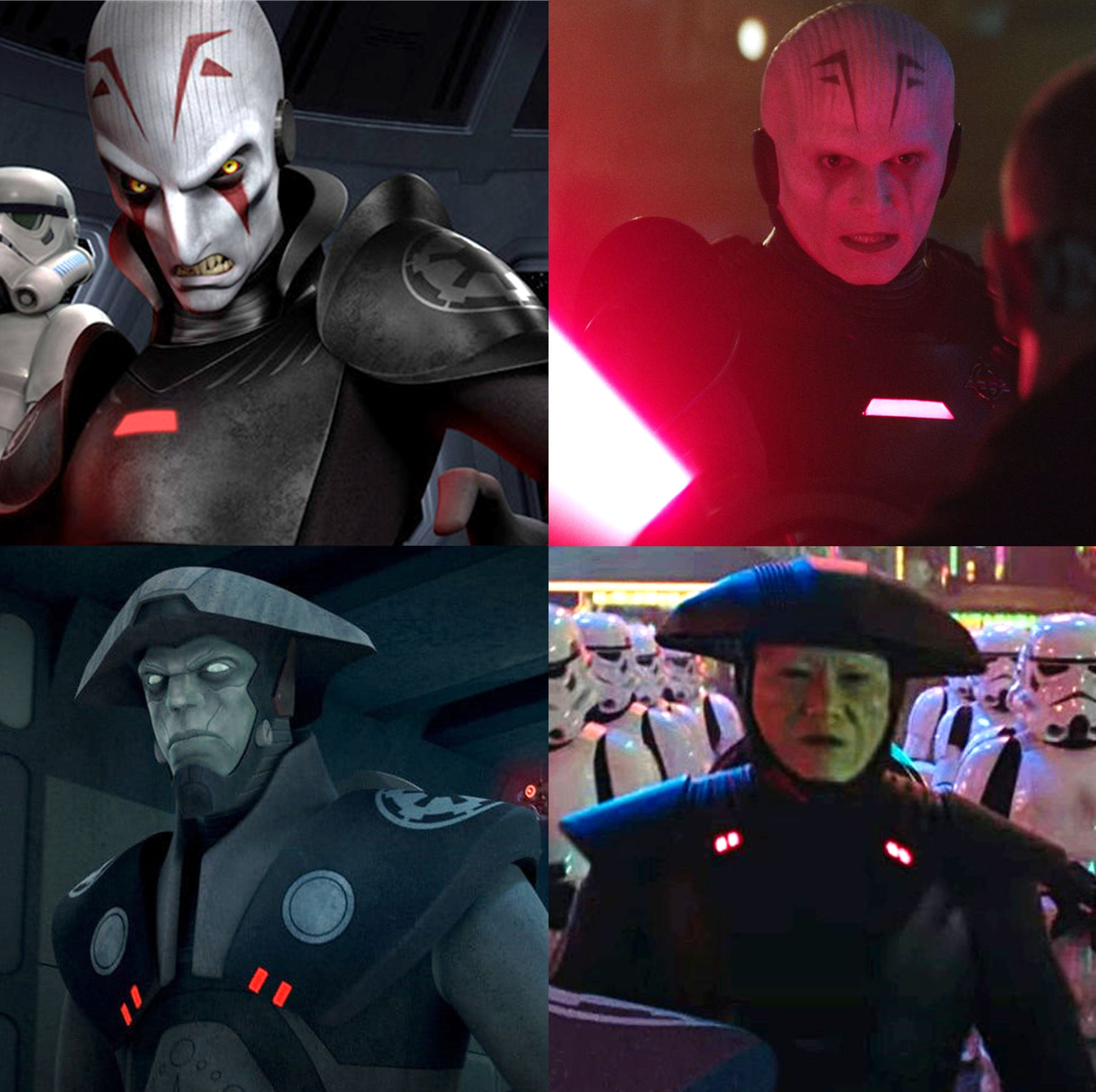 Помимо неё в сериале фигурируют знакомые по мультсериалу Повстанцы инквизиторы: Гранд Инквизитор и Пятый Брат. Вот только они выглядят совершенно не так, как должны. Сравните их облики на изображении. Воплощения, сыгранные актёрами, выглядят как мемы про адаптацию Нетфликса.