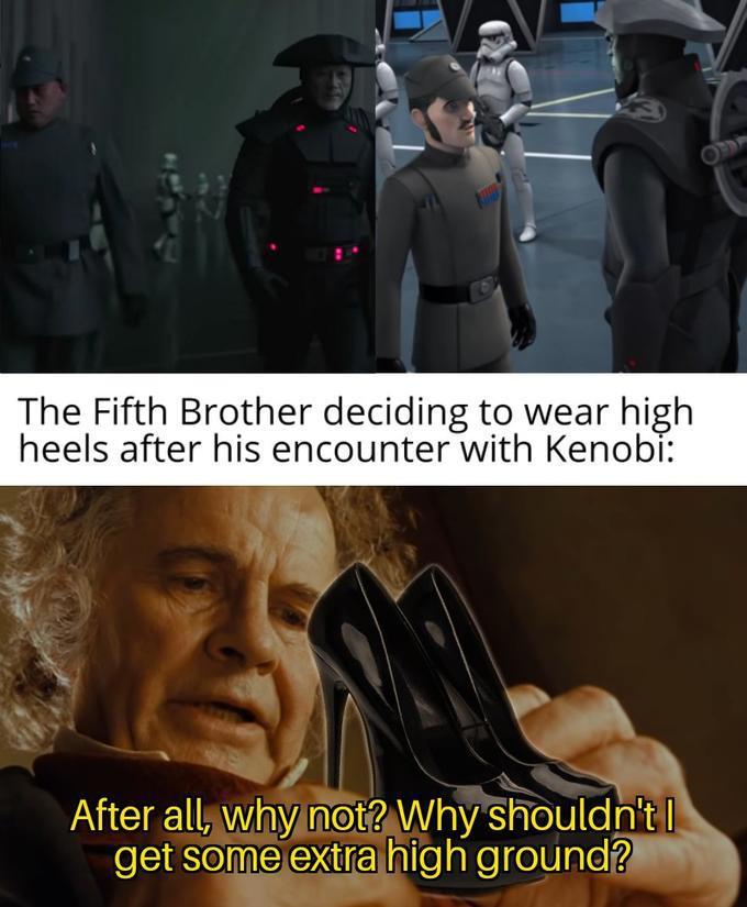 Пятый Брат выглядит совершенно по-другому. К слову, действие Оби-Вана Кеноби происходит в девятом году ДБЯ. Действие Повстанцев начинается в четвёртом году ДБЯ. Выходит, создатели Кеноби хотят сказать, что Пятый Брат имел чёрные глаза, которые потом побелели? Они хотят нас убедить, что у него был один цвет кожи, который позже стал серым? А ведь ещё и головной убор в игровом сериале больше похож на зонтик, да и ростом он ниже чем в мультсериале, словно после событий Оби-Вана Кеноби стал носить обувь на высоком каблуке (оба мема ниже).