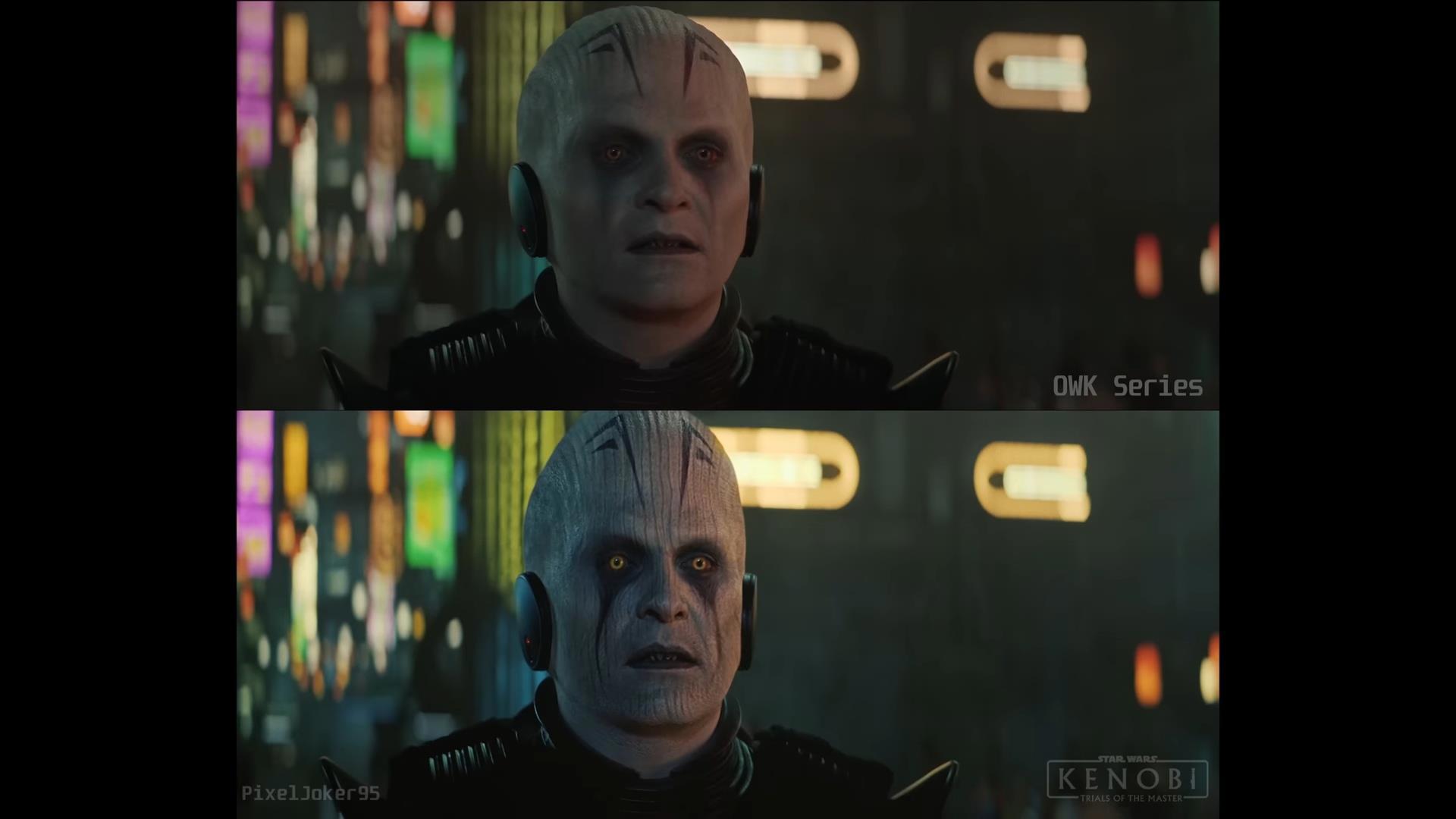 А ведь даже в кинематографичном трейлере грядущей игры Star Wars: Eclypse представитель данного вида изображён правильно. И голова вытянута, и зубы искривлены. Так почему в Кеноби не смогли сделать нормального пау'ана? Неужели пожалели денег? Я понимаю, что у сериалов по ЗВ низкие бюджеты, один лишь Андор отличился бюджетом, равным бюджету полнометражного фильма. Но всё равно низкие бюджеты не оправдание такой халтуре. А Ведь у Гранд Инквизитора ещё и цвет глаз отличается. Вместо чёрного белка глаз и жёлтой радужки у него по-человечески белый белок глаз и чёрная радужка. Режиссёр планировал попросить специалистов по компьютерной графике изменить цвет глаз, но забыл? Или же деньги подошли к концу? Или же со специалистами, работающими удалённо из-за ковида, было невозможно связаться?