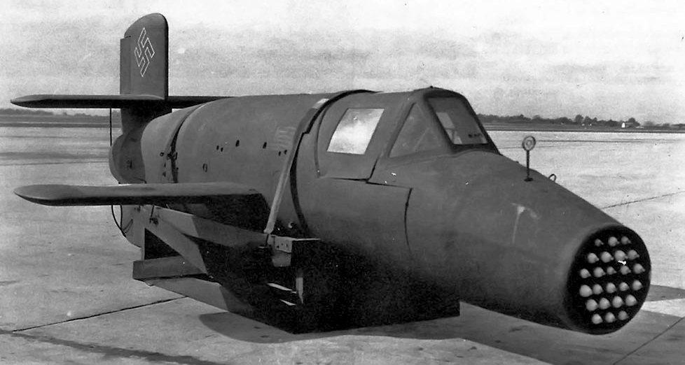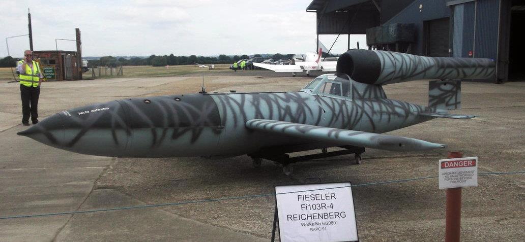 Все знают, или хотя бы слышали про Фау-1, которыми немцы постреливали по Лондону и окрестностям. Наверное, кое-кто сможет также припомнить, что английские лётчики научились-таки расстреливать в воздухе эти не очень быстроходные крылатые ракеты. Понятное дело, что немцы как-то должны были на это отреагировать. Они и отреагировали, создав пилотируемый вариант Фау-1. Их сейчас также можно увидеть в музеях. Вот такой образец самолёта-снаряда Fieseler Fi 103R Reichenberg: